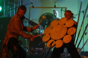 Four MASS members played this magnificent Earth Harp together on their first piece at Shanmukhananda Hall. This symbol of the world as an instrument of peace, of beauty, of harmonious sound sent a compelling opening message to the audience, and the momentum only magnified throughout the rest of the show. They revealed unique instrument inventions including the Aquatar, Drum Cloud, Drumbrella, Chime Sculpture and Wing Harp. They incorporated dramatic demonstrations of yoga in its most advanced form as Andrea Brook, Sarah Llewellyn and Peter Francyk expressed the music of MASS through movement. They even were able to collaborate with a phenomenal local tabla musician on a number of songs. Gasps of delight, spontaneous applause and shouts of praise from the audience added a soundtrack to the performance that only contributed to its powerful impact. On the final piece, Shawn Barry sang the hopeful melody of John Lennon's "Imagine," poignantly joined by the voices of over 1,000 audience members on the chorus. As MASS Ensemble took their final bow, the crowd leapt to its feet in a lengthy and enthusiastic standing ovation.
