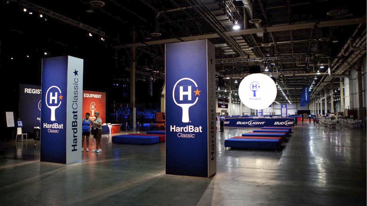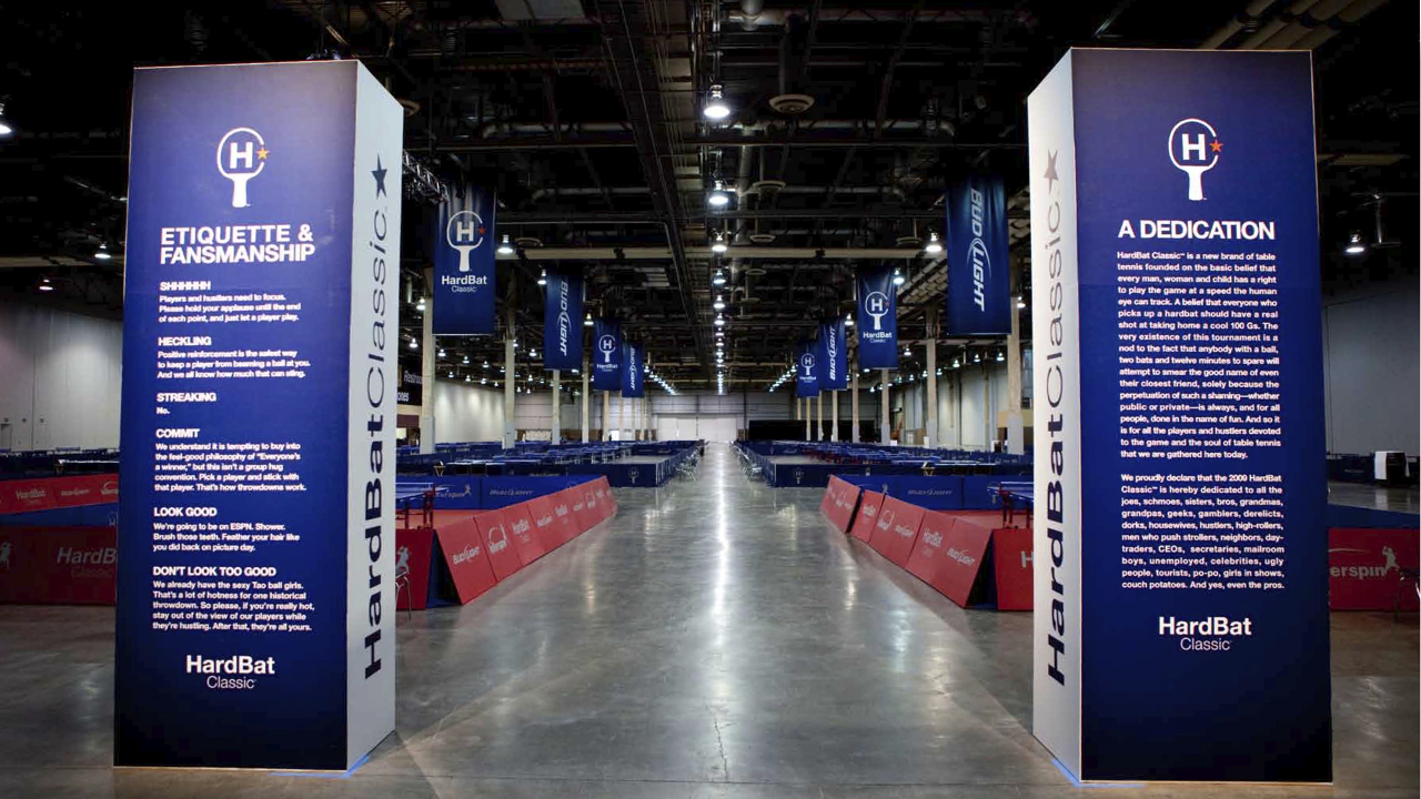 The tournament featured competition among over 500 players and hustlers, all played with old school bats made of only wood and rubber, pips out instead of sponge-padded bats. This style of play levels the playing field allowing amateurs and pros to compete fairly.Empire served as the event producer managing the design and execution of the physical build-out of the enormous Sands Expo Hall C space at the Venetian. The tournament village consisted of registration and equipment pickup areas, retail locations for sponsors KillerSpin and K-Swiss, a large central Bud Light bar & lounge area, a café and VIP area, mo re than 60 competition courts, four semi-final courts, and a carefully branded championship arena seating almost 500 fans.