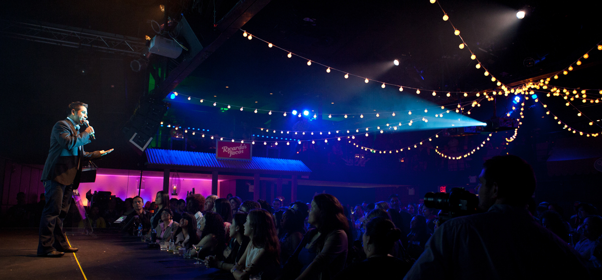 Viacom’s US Hispanic network, Tr3s: MTV, Música y Más joins forces with Empire Entertainment to deliver their annual Upfront event at the Highline Ballroom in NYC. Starting with the creative concept of a Latin street party, Empire sought to transform the venue into an embodiment of the brand’s bilingual and bicultural flavor. With existing VIP areas revamped into custom-built “taco and dulce storefronts set up along its perimeter, the Highline Ballroom in New York City was transformed into the barrio for Tr3s’ preview of the upcoming television season.” from Latin Recap Online. Through a mix of creative, technical, scenic and décor production, Empire completed the transformation of the Highline Ballroom into the look and feel of an outdoor street festival or block party. Channeling the festive spirit of a Latin street fair, this block party was universally styled, resembling a street that could be found in the Bronx, LA or Mexico City.The ceiling was draped with bistro lights, while food was served from stylized areas including a mock taco stand branded after Tr3s’ own Ricardo Laguna (from “The Ricardo Laguna Project”) and a Dulce storefront representing the network’s hit franchise: The Quieros (in particular, Quiero Mis Quinces and Quiero Mi Boda). Also installed in the room was a Colombian party bus from which DJ Mauricio Parra spun, enticing guests to climb on board and dance the night away. Colorful uplights and authentic décor accents completed the aesthetic, giving guests a transporting experience in a well-known venue. The presentation kicked off with comedian Erik Rivera taking the stage to warm up the crowd and focus the attention of a lively crowd. After a brief, but hilarious set, Erik introduced an opening video roll, which kept the audience laughing the whole way through. Actor and Executive Producer of one of the network’s new shows, Wilmer Valderrama, then took the stage to intro the high energy 2012 sizzle reel featuring music and imagery that embodied the spirit of the brand and built up the room’s energy.For the introduction of Tr3s’ General Manager & EVP, Jose Tillan, a live bike stunt by network star Ricardo Laguna was staged, simulating Mr. Tillan’s BMX skills. The presentation by Tillan kept the audience’s attention and moved along at a pace of interest that surprised guests when it quickly became time to for the live performance of the evening. The crowd roared as international super star, and Grammy & Latin Grammy award winner Juanes took the stage, ending the presentation and setting the upbeat, dance floor mood for the rest of the night. After Juanes finished his set, where one lucky guest was given a Juanes-autographed guitar, the DJ was back on the turntables and took the party into the night. Guests enjoyed tacos, nachos, ceviche, Cuban sandwiches and custom cocktails, all representative of the variety of flavors to be found at a street festival. From conception to execution our client’s objective and Upfront vision was achieved in every aspect of a seamless event. Strong partnerships with the Highline Ballroom and others led to precise implementation of the event. Empire is a full-service, creative production company that produces first class events for first class clients.
