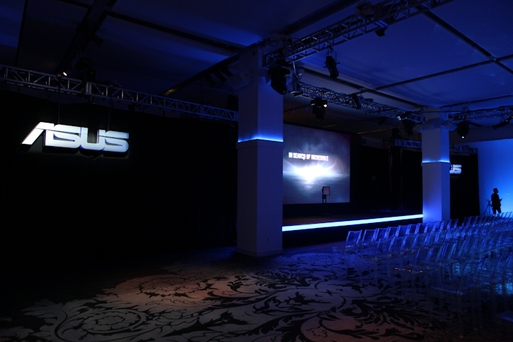 As a surprise finale to the show a closing recap video of all of the products, each combined with an onstage illusion by Marco, led to a reveal moment where two huge kabuki curtains flanking the left and right of the stage were suddenly dropped revealing long sleek display tables featuring all of the products just introduced. The media were on their feet and using the products just moments after the presentation ended as wait staff appeared to serve celebratory glasses of champagne.Working closely with the client's talented design team in Taiwan, Empire created all elements of the event including highly-finished stage design, furnishings and demo tables all consistent with the design excellence of ASUS. These elements included a custom LED trimmed stage, demo stations and two 8’ wide ASUS logos that were lit from within with LED lighting.