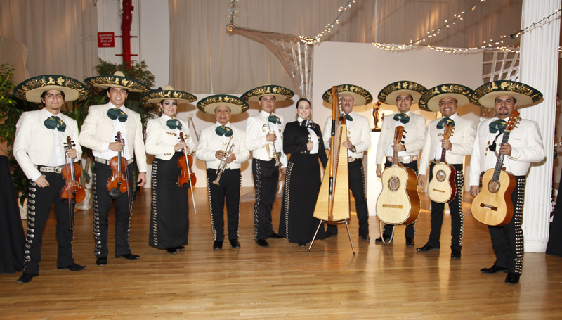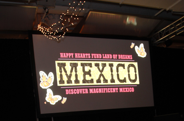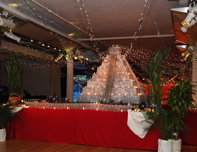 The evening’s journey began with a trip down the Happy Hearts Fund orange carpet past the airport arrivals board where flight attendants and airplane pilots welcomed guests into the Land of Dreams: Mexico. Once inside, guests were greeted by the image of a towering Chichen Itza pyramid decorated with flickering candlelight on each of its steps. A beautiful canopy of string lights radiated from the highest point of the pyramid casting a festive glow onto the entire party.