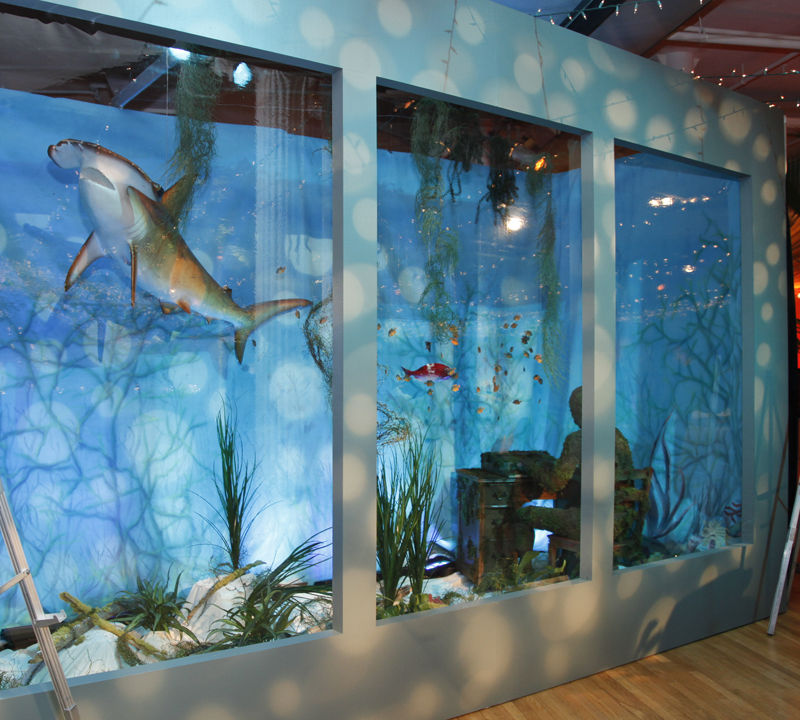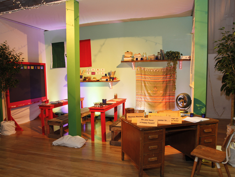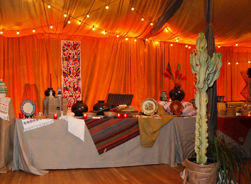 During cocktails, guests enjoyed live music by Mariachi Real de Mexico, while visiting a series of experience stations inspired by treasures from Mexico’s diverse states. These experience stations included Mexico City’s Museo Soumaya, the underwater museum, a craft and food market vignette, and the Happy Hearts school vignette. The Museo Soumaya vignette was inspired by the museum’s extensive collection of Rodin sculptures and its starkly modern architecture. The vignette spotlighted three Rodin replicas with dramatic lighting set against a sleek architectural backdrop. The underwater museum vignette was modeled after the Museo Subacuatico de Arte in Cancun and featured an underwater sculpture installation viewed through an aquarium window. The craft and food market vignette included beautiful displays of pottery, ceramics, baskets, and textiles from various regions in Mexico. In the food market portion, guests were offered a variety of tasting opportunities including mole negro, coffee from Véracruz, Ibarra chocolate from Jalisco, and three kinds of chili peppers from Oaxaca. The jungle vignette was dressed in lush jungle foliage, complete with an adorable live baby cougar named Zeus. The Happy Hearts school vignette was modeled after a Happy Hearts Fund primary school and dressed with traditional Mexican decor while featuring a live Spanish lesson activity.