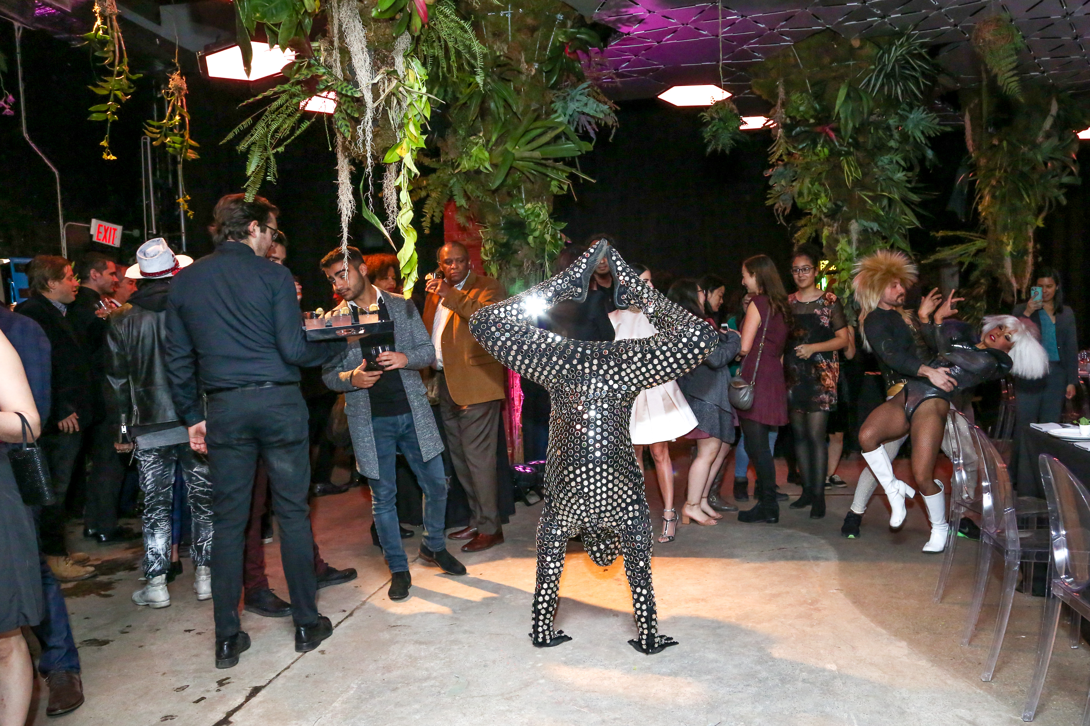 As guests entered a lush green entranceway they were welcomed to vines, branches, bromeliad plants, and handmade kokodama balls suspended from the ceiling, artfully installed by the talented John Mini Landscaping team. Guests enjoyed wine and cocktails sponsored by Reyka Vodka and Palm Bay Wines, and hors d’oeuvres made by Pinch Catering Designs. Under the overhead solar canopy and throughout the space, dancers, including the talented Mirror Man contortionist, presented by Vance Garrett Productions mingled with guests.