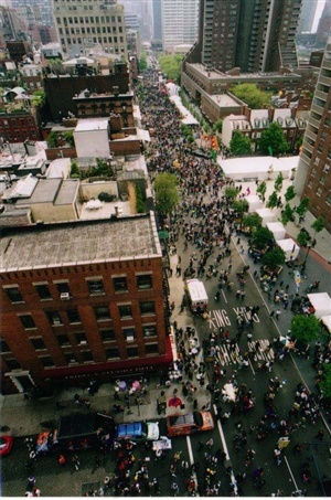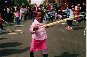 For the 2003 Tribeca Film festival, Empire Entertainment was again engaged to produce the festival's largest single component, the Family Festival, which drew an estimated 300,000 visitors over the course of the one day event. This year's family festival encompassed more than 10 blocks of TriBeCa and incorporated a series of large sponsored pavilions and many smaller vendor tents, outdoor stages and activities. Empire Entertainment managed the entire event and provided virtually all services including tenting, permitting and street closure, community relations, integration with city agencies, security, electrical power distribution, decor, staging, sound, lighting, labor, bathrooms, street cleanup, video and A/V, event design and layout, stage management, etc. The key features of this year's event were a reading room and library by Scholastic which again featured storytelling by Whoopi Goldberg and others, a Bloomberg pavillion, a DJ station where children could learn to scratch and mix music, a Starbucks Coffee House pavillion which featured a full afternoon of live talent, a General Motors pavillion which featured an exhibit on hydrogen fuel cell technology and a futuristic hydrogen vehicle, an American Express pavillion where children created crafts, an additional arts & crafts pavillion where children could draw, paint and assemble collages and sculpt, and a Puppetville world which included a series of puppet performances. There were also approximately 50 tents for local merchants, restaurants and crafts people. Another feature of the event included a Tennis area by the USTA, a basketball area operated by the New York Knicks, a fencing area, giant street chess, sidewalk chalk painting, a public art mural, a face painting area, a kite making workshop, jewelry making, and dozens of other activities. There was also a main stage and 5 satellite stages where performances happened throughout the day as well as more than 100 street performers who entertained children and families continuosly throughout the event.