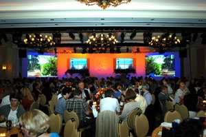 Empire again designed, built and installed the conference's Resource Center in which twenty one client participants / partners were provided custom-designed spaces to showcase their latest materials to the conferences 300 attendees. This space also served as a place where attendees could relax, network and check email between general sessions. Empire completely transformed a 100' X 50' ballroom space into an indoor garden, that featured Italian, English and Florida tropical themes, complete with a beautiful white email gazebo in the center of the room and an indoor fountain that enhanced the rooms ambience. These elements were complimented with a combination of various styles of outdoor garden furniture, beautiful garden-themed props, baker's racks for participants materials, computer monitors were provided as well as wireless internet connections for participants. Finally, Empire designed the General Session stage to compliment the Resource Center garden theme. The staging was then built by the client and dressed by Empire on site. The client and participants constantly complimented Empire on a job well done again this year. Many of the participants and attendees have attended this conference every year and are constantly surprised at how we conceptualize and implement a business function in a unique environment, not generally seen in the conference world.