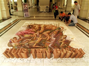 Working with Empire and Dentsu, Huis Ten Bosch's agency, Kurt developed ideas for two separate street paintings based on the theme of metamorphosis. He also allowed for the integration of Huis Ten Bosch's Autumn Harvest Festival into the context of the pieces. Both designs prominently featured Huis Ten Bosch's name, allowing for maximum PR and word of mouth exposure (through both PR and guest photos). Kurt's ability to combine extraordinary drawing talent with a perspective technique virtually lost in today's creative process created large scale one of a kind works that dazzled park visitors.Kurt Wenner's works utilize a Baroque era painting technique called Anamorphism. Wenner's unique and innovative use of anamorphic perspective creates unforgettable images that combine the painted surface with its surroundings into a single composition that appears 3-dimensional.Kurt's first work for Huis Ten Bosch, "The Banquet of Circe," was inspired by Homer's Odyssey. The painting features a scene where the sorceress Circe offers a bountiful harvest to the hungry companions of Ulysses, but the magical food transforms them into animals.Kurt's second work "The Triumph of Puck" was inspired by Shakespeare's A Midsummer Night's Dream, and features Puck, having transformed the farmer "Bottom" into a donkey as the sprites harvest grapes, pumpkins, chestnuts, and mushrooms in the foreground.These paintings were both executed on the floor's flat surface using Kurt's hand made pastel chalks. They represent the first street paintings Kurt has ever created in Japan, and were tremendously well received by Huis Ten Bosch, the media and the park guests.