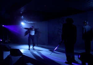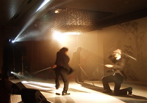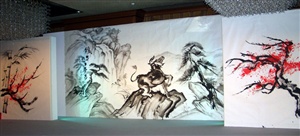 The evening's entertainment opened and closed with energetic sword fighting performances by a group who are known for their work choreographing the fight scenes in Quentin Tarantino's motion picture Kill Bill, Vol. 1 and playing the Crazy 88 characters in the movie. The guests were also treated to a unique dance performance, during the mid point intermission, by an accomplished Japanese tap dancer tapping to the sounds of a traditional Japanese Biwa string musician. The heart of the evening's entertainment though was a live painting exhibition by talented calligrapher-painter, Toun Kobayashi, who created impromptu a large Japanese landscape painting covering the length and height of the main stage. Kobayashi sensei was assisted throughout his performance by the inspirational sounds of a musical fusion ensemble consisting of an Australian didgeridoo musician and traditional Japanese musicians playing the shamisen and the Shakuhachi flute. By the end of the program, Kobayshi sensei's performance finally culminated in a striking work of art that was traditional in its style, but also relevant to the client and the guests attending the evening's event.