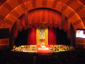 The production team was able to secure several sponsors to donate their services and products to keep costs as low as possible. Onstage carpeting, dressing room and backstage furnishings were generously donated by ABC Carpet and Home. Turning Star generously fireproofed all onstage fabric pieces including the donated carpets and sacred Thankga banner which had been personally selected by the Dalai Lama and sent from India specifically for these teachings. In addition to image magnification projections on Radio City Music Hall's large LED screens, Empire coordinated the taping of all sessions with a five camera, high-definition video package. This was done in preparation for both a soon-to-be-released DVD version of the teachings and a National Geographic special release based on the Public Talk.The historic teachings drew a full house at Radio City and the public talk on Peace and Prosperity, introduced by Richard Gere was completely sold out. Following his New York visit, the Dalai Lama traveled to Washington DC where he was presented with the Congressional Gold Medal by President George W. Bush. Empire is honored to have had an opportunity to help present the teachings of His Holiness the XIV Dalai Lama at Radio City Music Hall.