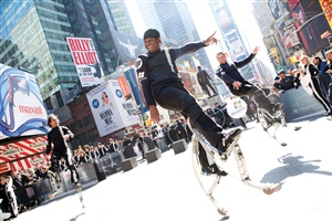 The team of 32 performers, which also included some of the Radio City Music Hall Rockettes, were dressed in sleek, branded racer-like costumes. Each performance began with the cast separated into four separate groups. Each group of eight performers entered Times Square from a four block radius in order to build buzz and draw audience from afar. After five minutes of pre-show the four groups converged on Duffy Square island (where the TKTS booth is located) bringing together a momentous crowd. As the multitude of onlookers and tourists steadied their cameras for a free show, Antigravity® kicked into high gear and delivered a ten minute performance that included Rockettes-type choreography, extreme acrobatics, contortion, tumbling breakdancing, cyre wheel and other Antigravity specialties. One of the unique features of this performance was the use of performers to create a 16' wide X 9' high ‘living billboard' that displayed a series of advertising images and functionality demonstrations as the performers exchanged and flipped cards to create image after image. After the final image, the boards and performers pulled apart to expose an open stage area that transitioned into the famous finale of the Antigravity® Jumping Boots, which catapulted performers fifteen feet in the air into dynamic tumbling sequences. The audience was left speechless and met the performances with rousing applause as they rushed to meet and take photographs with the performers post event.