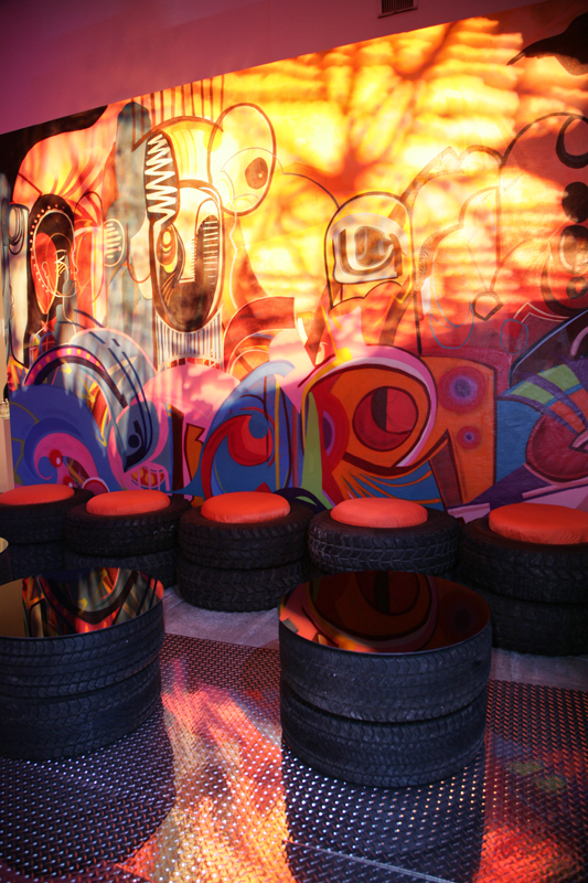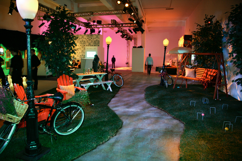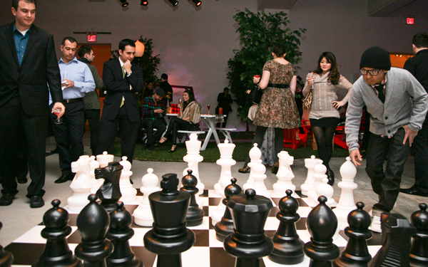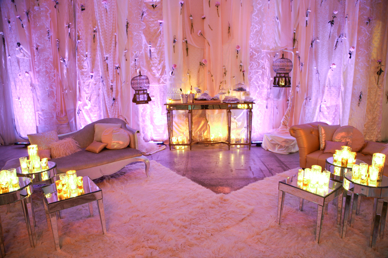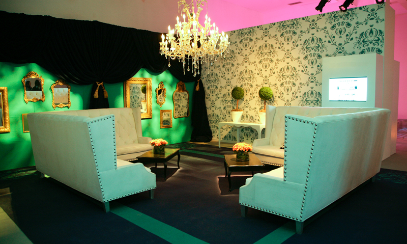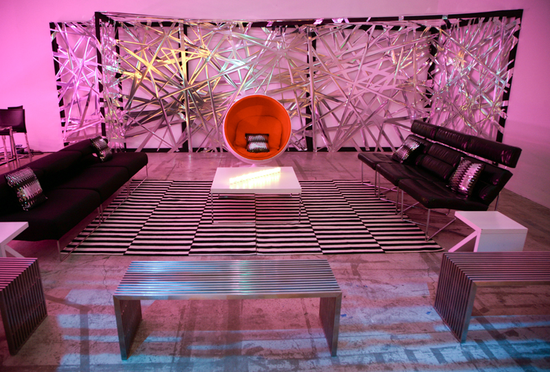 Skylight’s large raw space was sectioned into individual, stylized vignettes in the themes of “Boho”, “Romantic”, “Classic”, “Edgy”, “Casual” and “Street.” Each vignette incorporated décor elements, lighting, and custom furnishings and featured sleek demo stations to showcase the website to attendees.The vignettes also featured distinctive live entertainment, activities, décor elements and a menu of thematically-linked hors d’oeuvres and specialty cocktails. The street vignette included laser graffiti show, break-dancing performances, a large graffiti wall and banquette seating made out of tires and galvanized steel. In the “Classic” vignette guests enjoyed a life-size chess game, and sat of oversized tufted banquettes under a large crystal chandelier. Guests had their fortunes told in the lavishly decorated “Boho” vignette adorned with lanterns, Moroccan poufs and beaded curtains while guests in the “Romantic” area enjoyed an aerial performance surrounded silk and lace accents, birdcages and candles.In the hallways a fashion show of live model “mannequins” on pedestals wearing various couture and looks created by top fashion designers and stylists was presented with models changing throughout the evening.