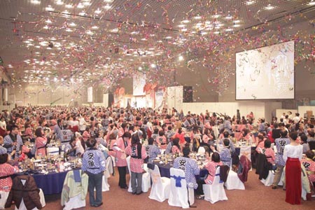 Altogether, Empire cast well over 100 performers for the evening including Fuku-musume, Samurais, Ninjas, Sumo wrestlers, originally choreographed traditional Japanese tap dancers, and live musicians.The entertainment finale of the evening featured 57 dancers performing Yosakoi, an exciting Japanese festival dance. The performance was highlighted by the synchronized dance on all 3 of the stages-creating an atmosphere in which every seat in the hall felt central to the excitement-and participation in the dance by all 1,100 of the guests.