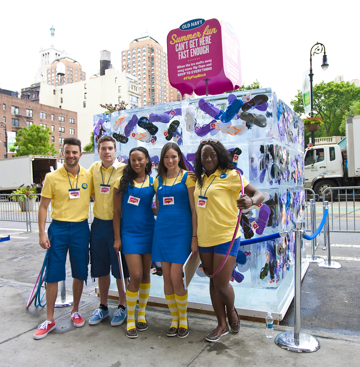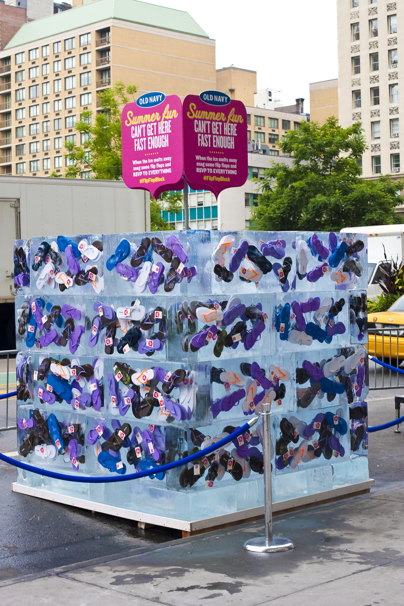 The concept for the project was to create a giant, 10 ton ice cube with hundreds of colorful Old Navy flip-flops frozen inside. Through the course of the hot summer day, the ice would melt, thus freeing the flip-flops for the public to take. In New York, Empire took over the north side of East 17th Street at Union Square to install the mammoth 7' square block of ice. During the course of the day, thousands of passersby interacted with the ice block and got into the spirit of summer by participating in hula hoop competitions for prizes.In New York Empire assisted provided all onsite production supervision and staffing. Empire also assisted with venue selection, coordinated with the ice vendor, staffed and trained a team of brand ambassadors, produced custom 4-sided signage and provided onsite management of the event.In Tokyo, the event coincided with the grand opening of the first Old Navy store in Japan -- at Odaiba's premier shopping mall DiverCity Tokyo Plaza. Building the ice block at this prime location garnered an thousands of interactions and brand impressions over the course of the day. Empire's New York City and Tokyo offices oversaw every aspect of the Tokyo event including venue selection & acquisition, sourcing of and coordination with the local ice vendor, staffing and training a team of brand ambassadors, production of custom 4-sided signage, event budgeting, translation, cultural consulting, and onsite management of the event. Empire also worked closely with the Old Navy and Gap Japan clients to ensure effective communication amongst all parties in the United States and Japan.With abundant international resources, Empire Entertainment is a proven leader of executing innovative, consumer-face brand marketing projects across worldwide markets.
