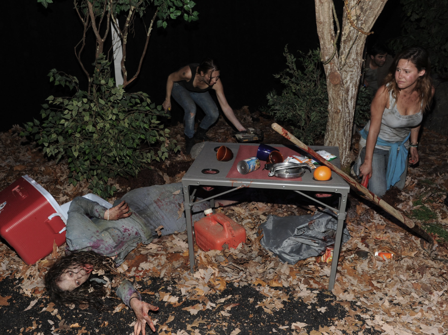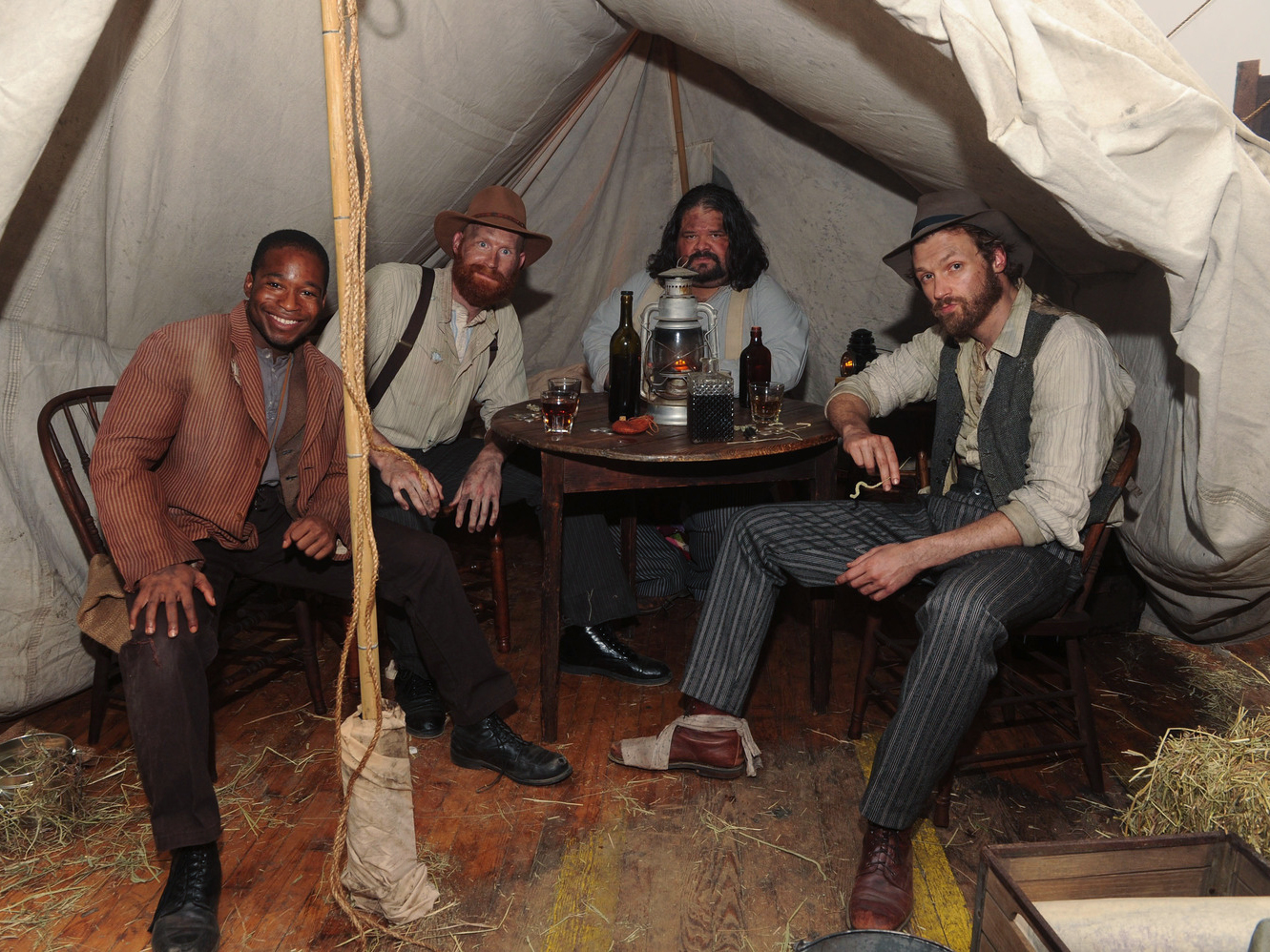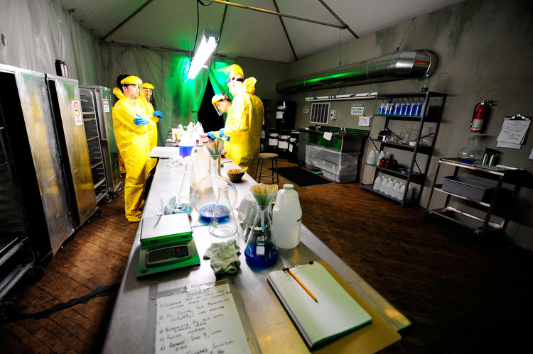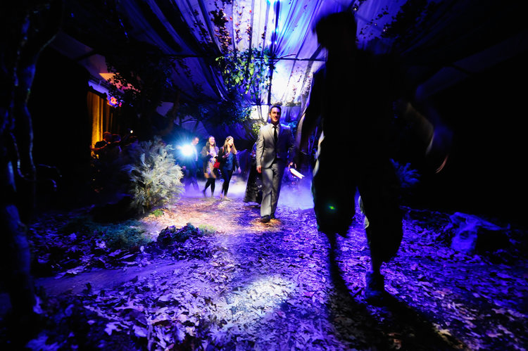 A forest full of Walking Dead-like zombies, a functioning meth lab akin to Breaking Bad, and a Venice Beach freak show full of the sword-swallowing, fire-breathing stars of Freak Show were just a few of the experiences within the labyrinthine event. Upon arrival, guests were greeted with champagne and walked down a meandering hallway of illuminated show posters displaying AMC’s extensive slate of original programming. At the end of the hallway, fog rolled out from a draped doorway, and guests stepped into a chilling nighttime forest scene - on one side an overrun campsite, on the other, a rattling shack full of moaning “walkers.” Hunting parties of disheveled survivors would run by suggesting guests go left or right to safety helping to determine the pathway of their experience. Stepping through the next draped opening, guests found themselves in a tent town on a vast prairie, a space designed to echo the 1867 setting of the series Hell on Wheels. To the left, three surly men played a round of poker, while prostitutes in a tent across the way cat-called at passersby. Sounds of blowing wind, and the occasional train whistle along with smells of whiskey, hay, and dirt rounded out the experience.Through another palate cleanser, and another draped entryway, guests walked into a local talent competition set in a YourTown, USA theater. Here, variety acts performed all manner of humorous and inspiring acts, demonstrating the look and feel of AMC’s new unscripted show, “Showville,” where small towns hold local talent competitions and award the winner $10,000 prizes.