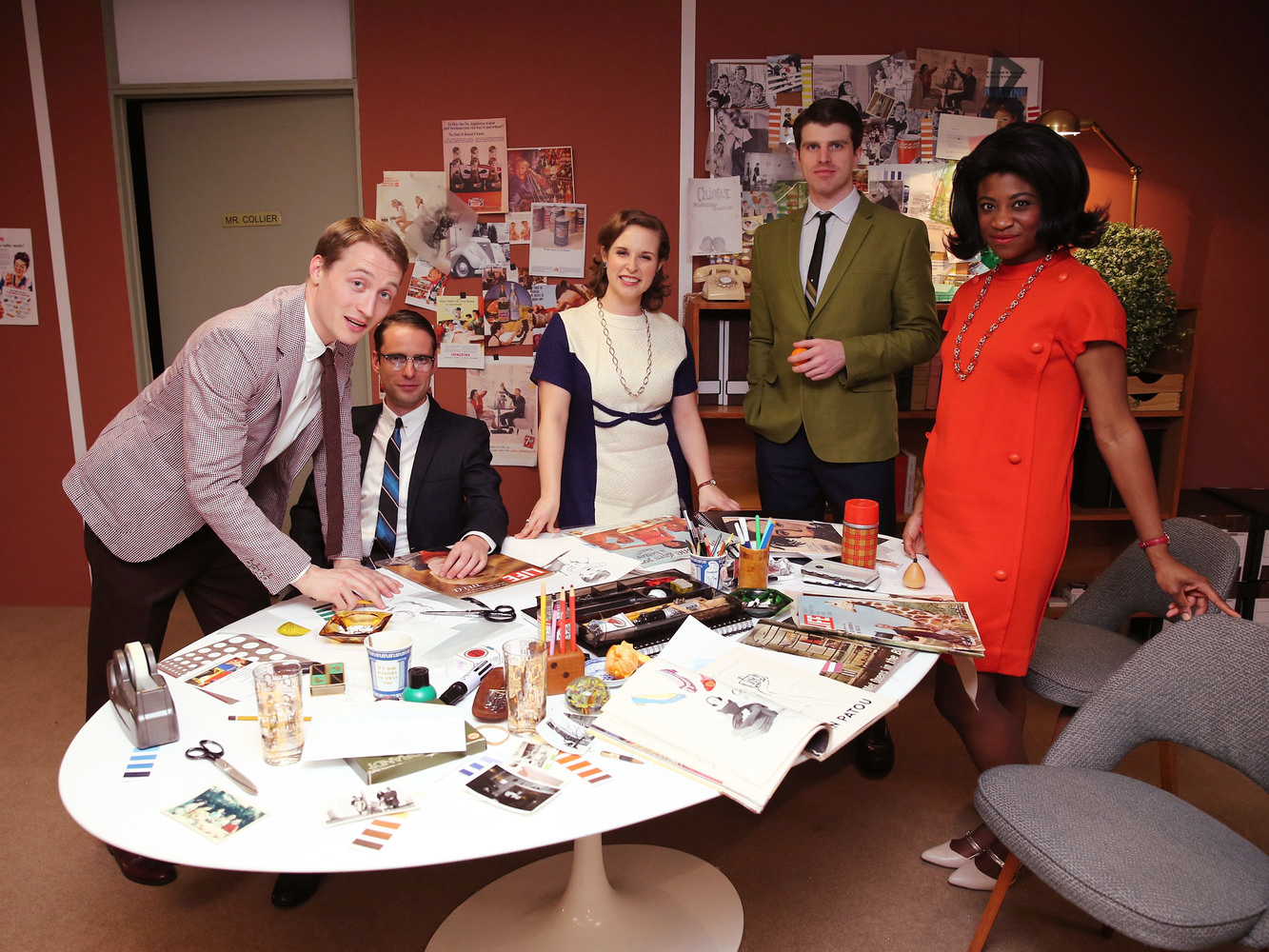 Continuing on, guests found themselves walking down a long hallway with fluorescent overhead light and ceiling tiles. Reminiscent of the hallways of Sterling, Cooper, Draper, Price from Mad Men, advertisements from the late 1950s and 60s adorned the walls, and every so often, a secretary dressed in period attire would rush down the hall warning “Mr. Swanson is in a terrible mood today!” Around the corner, guests found themselves in the bustling creative office of a 1967 advertising agency. Creative Directors dressed in period attire stood smoking, brainstorming period campaigns and offering guests whiskey from the bar cart. Continuing on, around the next corner, guests entered into a carnival-esque room, wrapped in red velvet drape and topped with a striped black and white ceiling. Large banners adorned the walls, warning of the “Great Spider Woman,” “Gorilla Girl,” and “Voodoo Mysteries.” From a drum stage, actual cast members of “Freak Show” performed phenomenal acts of sword swallowing, fire breathing, and contortion, while America’s tallest man, George Bell, who is 7’8” tall stood by to meet and greet attendees.