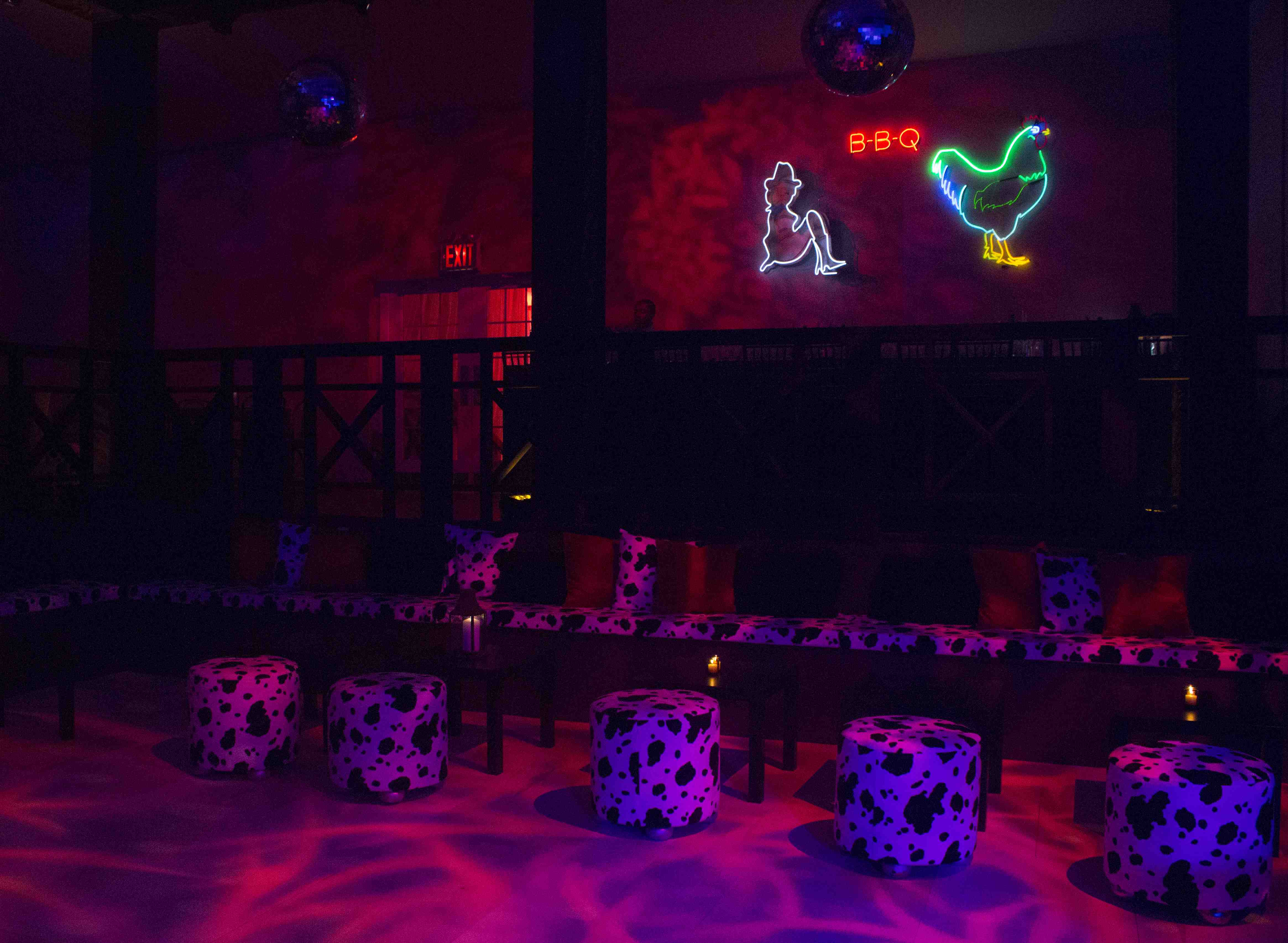 When the day arrived, the weather was perfect. Guests arrived down a stately gravel driveway, flanked by 10-foot high hedges, and pulled up in front of a cocktail tent overlooking the water in which Empire had programmed light and client’s preferred background music. Guests then moved into a tent to be seated for a dinner followed by remarks and a tribute video. But it was not until the guests moved into the entertainment tent that the full scope of the party’s plan was revealed. Inside this large tent built with a sunken pickled birch wood dance floor and cowhide banquettes, the production and design team had created the perfect environment for an entertainment presentation and after party.