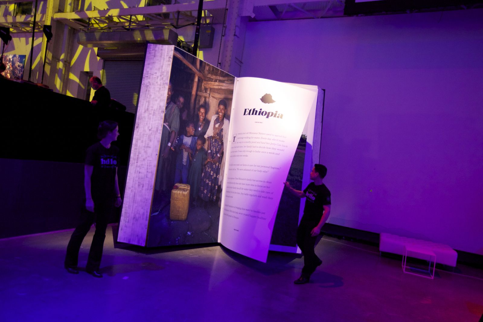 As guests entered the Greenhouse they found themselves inside a giant gallery. Through interactive scenic installations and larger-than-life pictures from the field, charity: water told just a few of the many stories of the individuals affected by charity: water. The organization’s signature Waterwalk, where they ask guests to walk a fraction of the distance that people in developing countries walk to bring water home to their families, became the focal point of the event. Utilizing the RFID responsive technology, we tracked each participant that walked the Waterwalk, with Caterpillar Foundation donating $1,000 per person totaling $1M raised. We also refined the live auction pledge experience designed last year to encourage as many guests to donate as possible, again utilizing the RFID bracelets to pledge and track donations ranging from $100 to $90K.