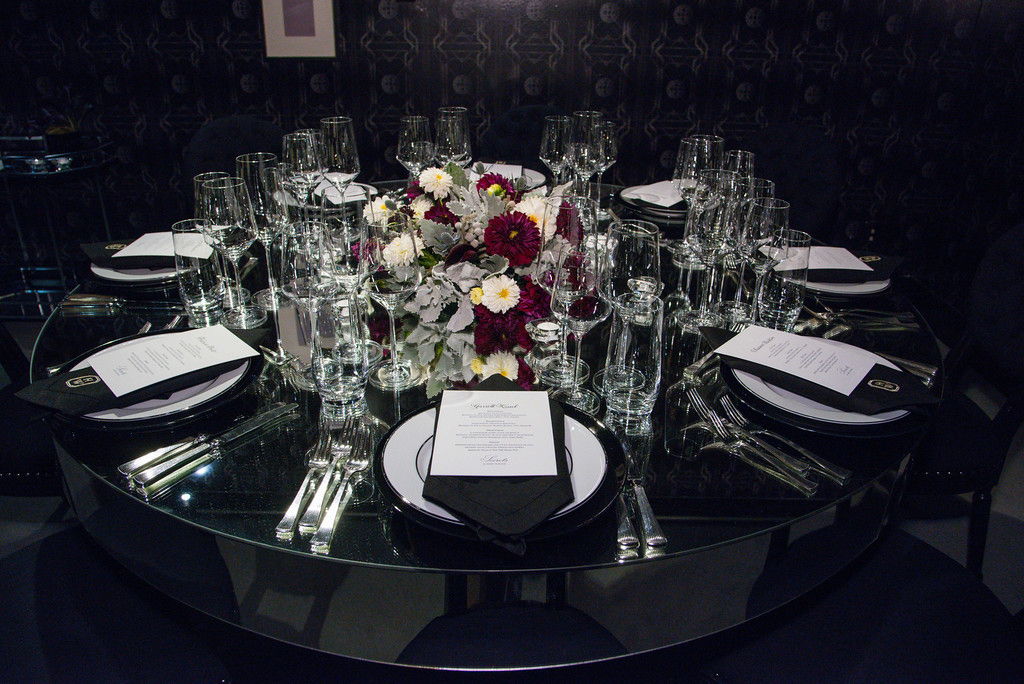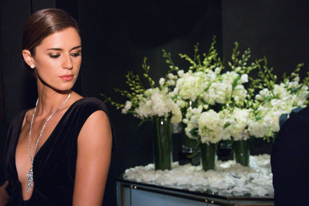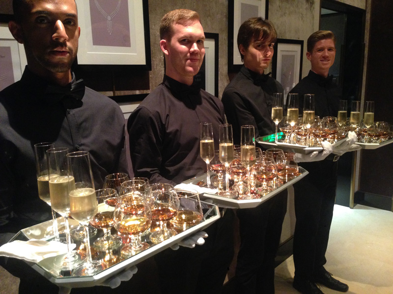 After mingling on the terrace on a beautiful Beverly Hills evening, guests enjoyed a seated four-course meal created by Patina Caterers. Courses included Blue Fin Tuna Tartar, Alba White Truffle Risotto, A-5 Japanese Kobe Cote de Boeuf, and a Cranberry Chutney Cheesecake Sphere for dessert, unveiled by the lifting of a cloche glass. Each course, accompanied by pairings of rare wines, was delivered to the guests via choreographed and synchronized waiter service, intermingled with the female models, which gave the guests more time to get a closer look at the jewels.