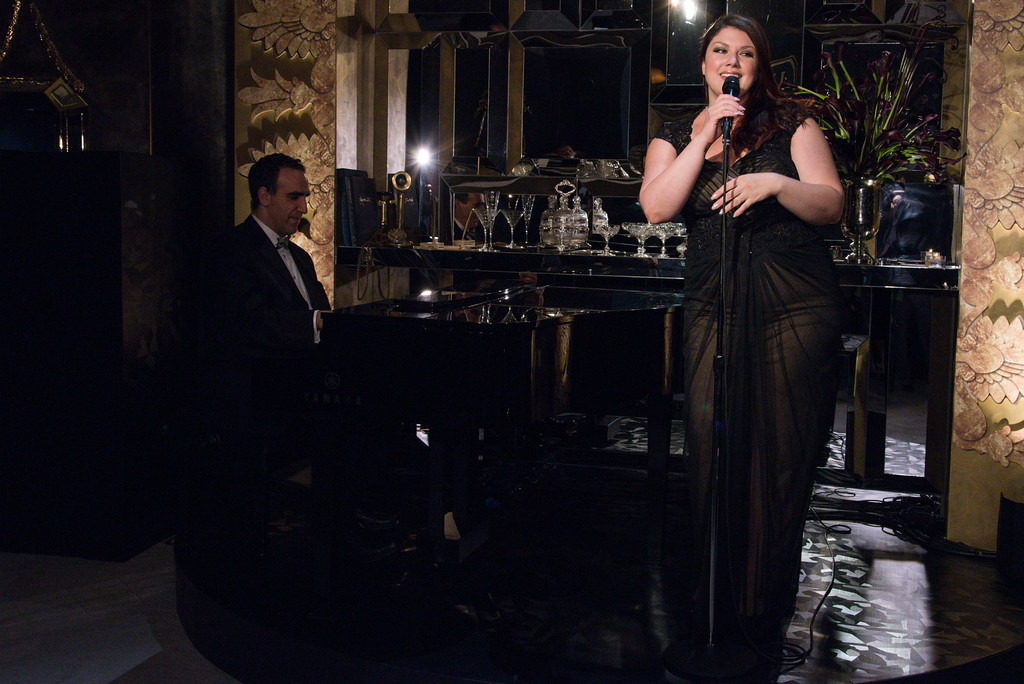 Following dinner, guests were invited back downstairs into the yet-again transformed salon, which was now recreated as an elegant Jazz age nightclub. Guests were seated on black leather lounge furniture and served Yuku Kosho Caramels along with vintage cognac, single malt whiskey and dessert wines. As a finalé to the evening, guests were treated to a live performance by Grammy-nominated jazz vocalist Jane Monheit, accompanied by her pianist, who performed on the tableau vivant stage.