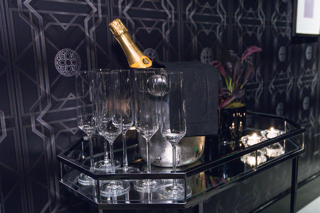 Stepping through the doors guests entered the dimly-lit salon transformed into a breathtakingly elegant, Art Déco-era house of secrets. Model wait staff served custom cocktails and bespoke hors d oeuvres, including caviar pillows and black truffle beignets presented on polished black lacquer trays in unique jewelry-inspired vessels. While enjoying Nicolas Feuillatte Brut Champagne in tall champagne flutes, guests were treated to the first glimpse of the collection, showcased on a group of exquisite female models placed within a tableau vivant or ‘living picture’. With glamorous hair, makeup and wardrobe to mirror the aesthetics of the jewelry collection, the models' movements and interactions with the guests were choreographed by Emmy-award winning director duo, Nappytabs.