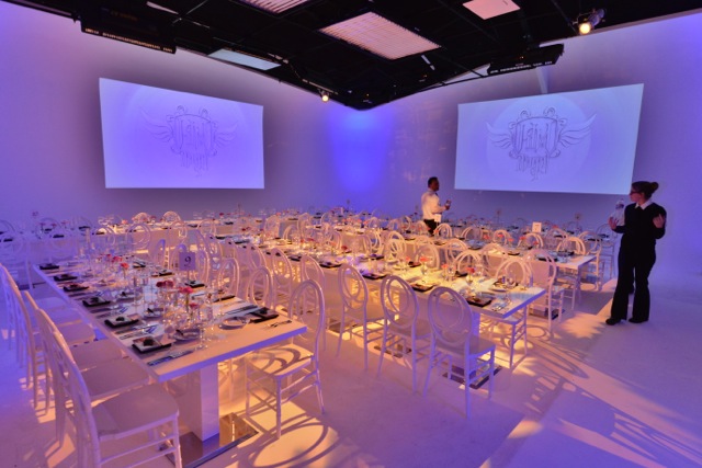 After cocktails, guests were ushered into the Future’s sleek white contemporary atrium and soundstage space which had been trans4med into an elegant dining room with long banquet tables. Flourishes of color from florals, lighting gobos and projections added to the futuristic aesthetic.
