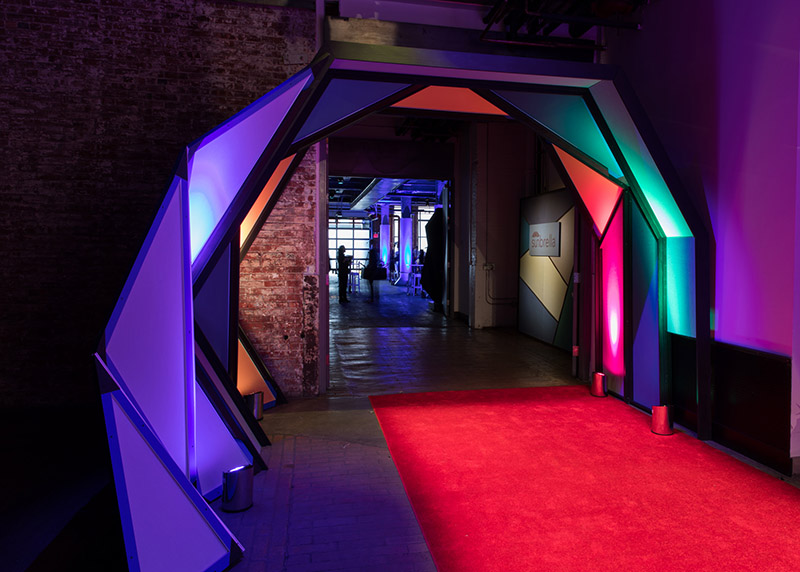 Guests received their first taste of technological innovation at registration, where they were welcomed by name on a reactive LED screen installation covering the full width of the entry wall. A large lunch café was created with a décor scheme that incorporated custom-built, ceiling-high steel LED frames draped with foliage to create smaller, intimate restaurant-style spaces that displayed both technology and nature.