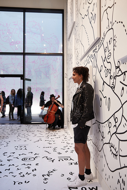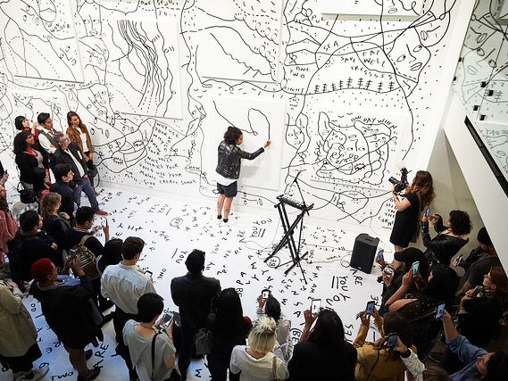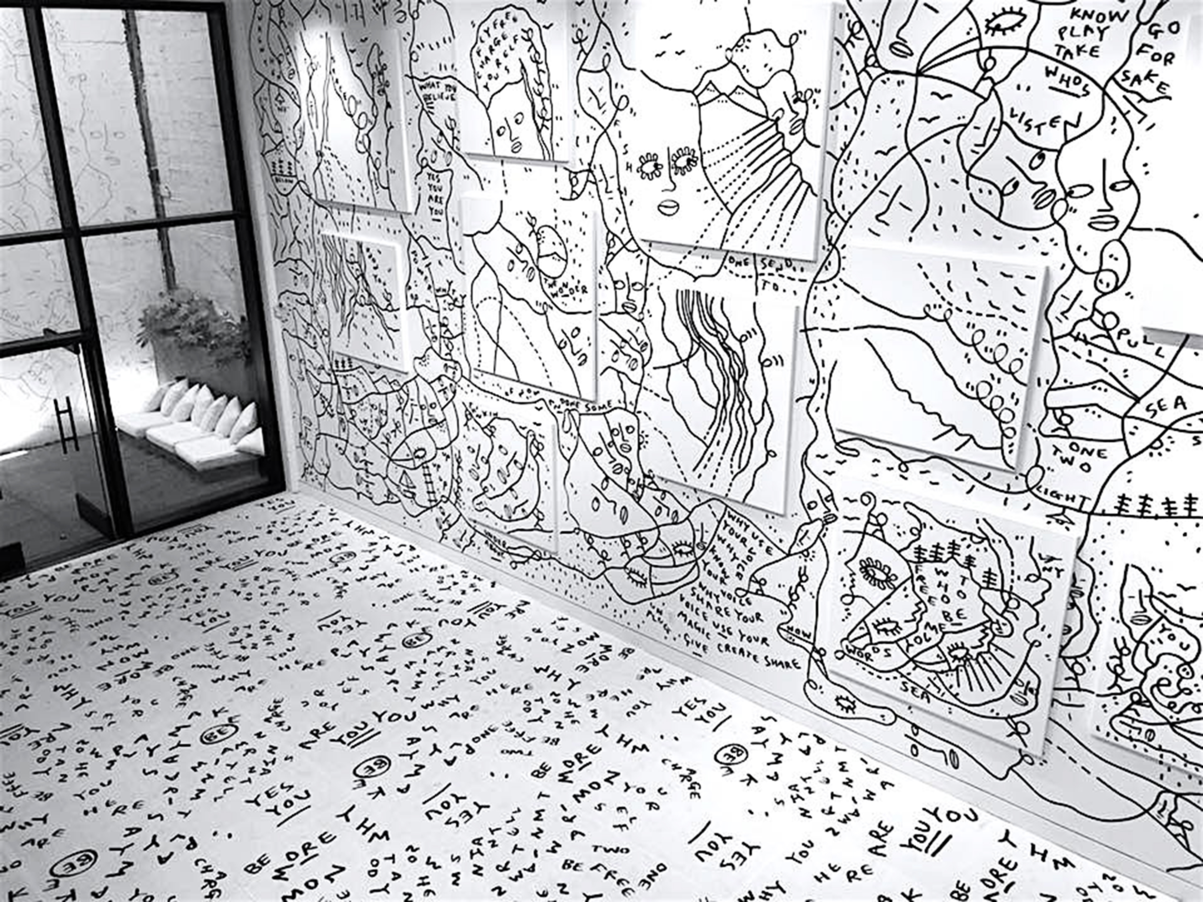 Shantell Martin’s unmistakable drawings are visible both inside and outside of the gallery, as well as underfoot on a floor installation.