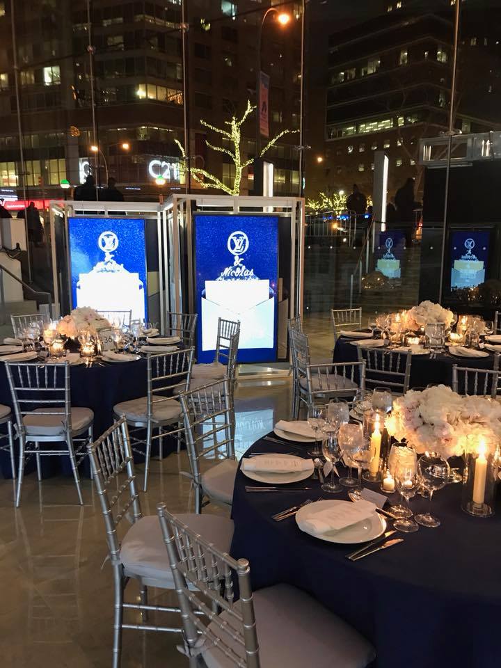 Following the stage program and performance, guests were invited into the Hall lobby for dinner, where the elegant table settings were surrounded by a multi-media installation featuring various Louis Vuitton content curated specially for the event.