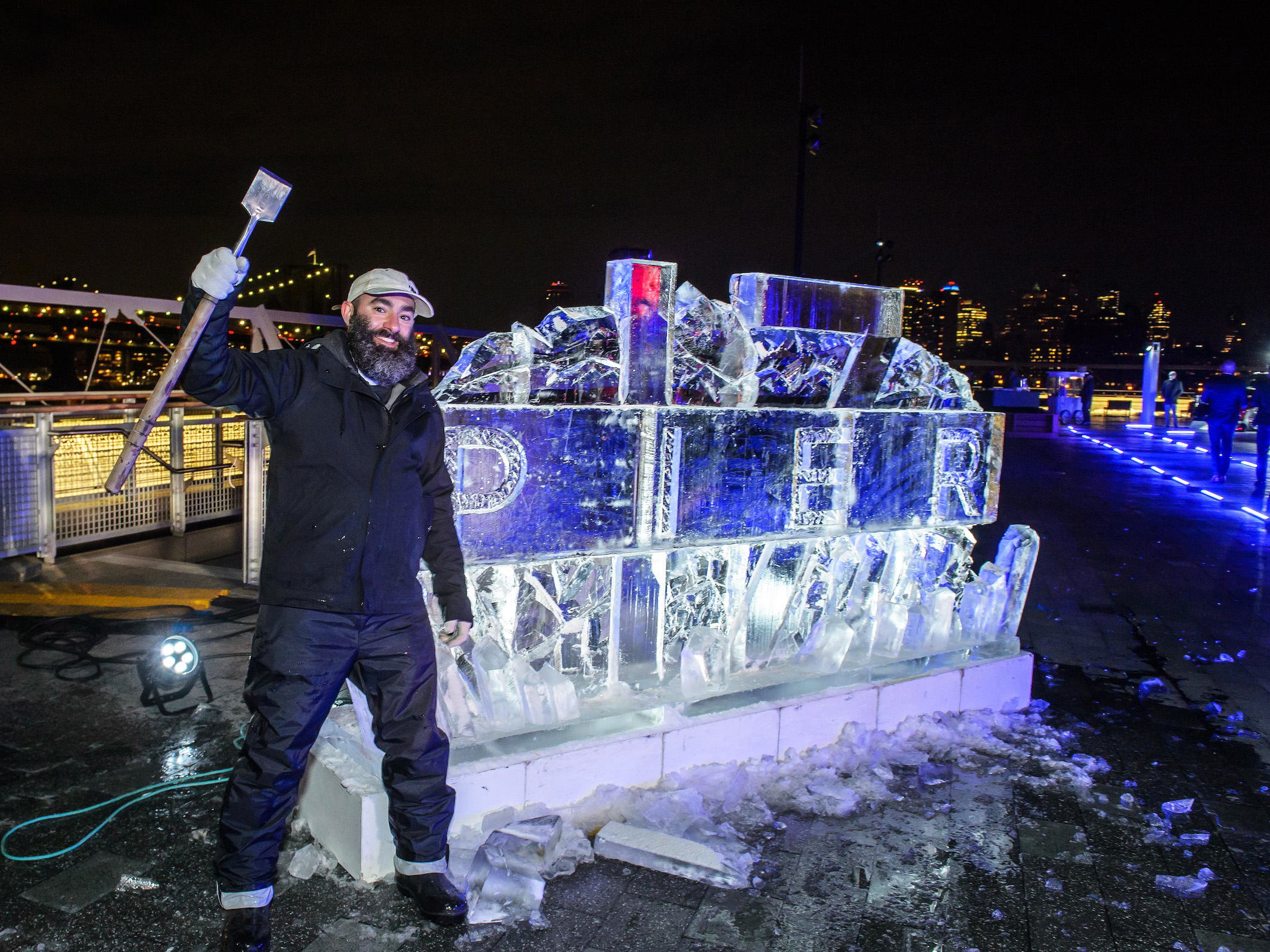 Large French doors and a lighted path of LED tubes beckoned guests outside to the viewing deck to take in the gorgeous views and a live carving of an ice sculpture, while sitting by inviting fire pits overlooking the East River, wrapped in warm blankets and sipping hot apple cider toddys.