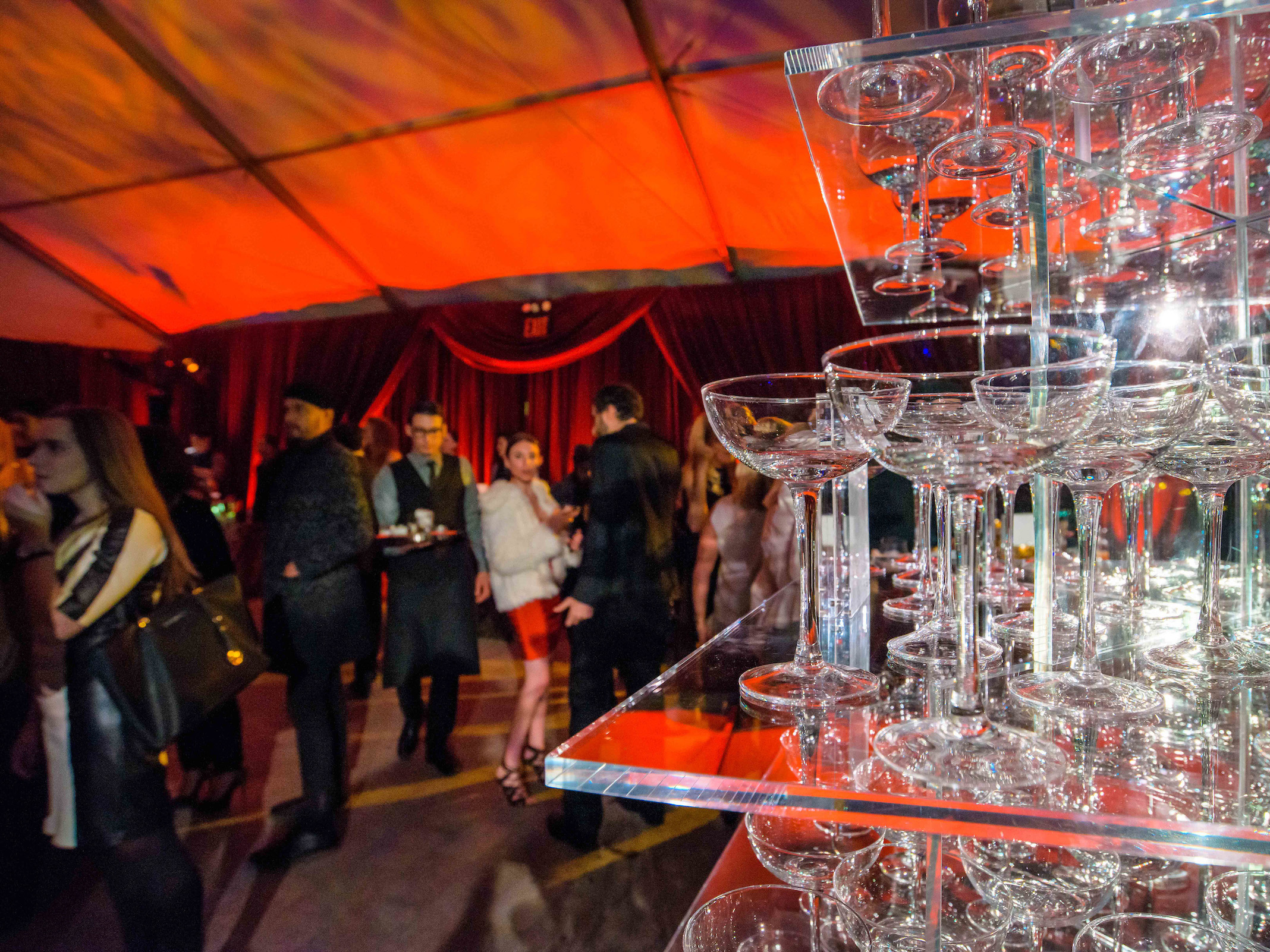 The interior space was flanked by two clear navi-trac tent structures, allowing guests to enjoy the breathtaking views while they enjoyed built-out lounge spaces featuring a towering Champagne Bar and Bourbon Bar, signature cocktails prepared at the 16’ diamond-cut ice bar by Okamoto Studio, and an eclectic menu of delicious foods provided by Olivier Cheng Catering.