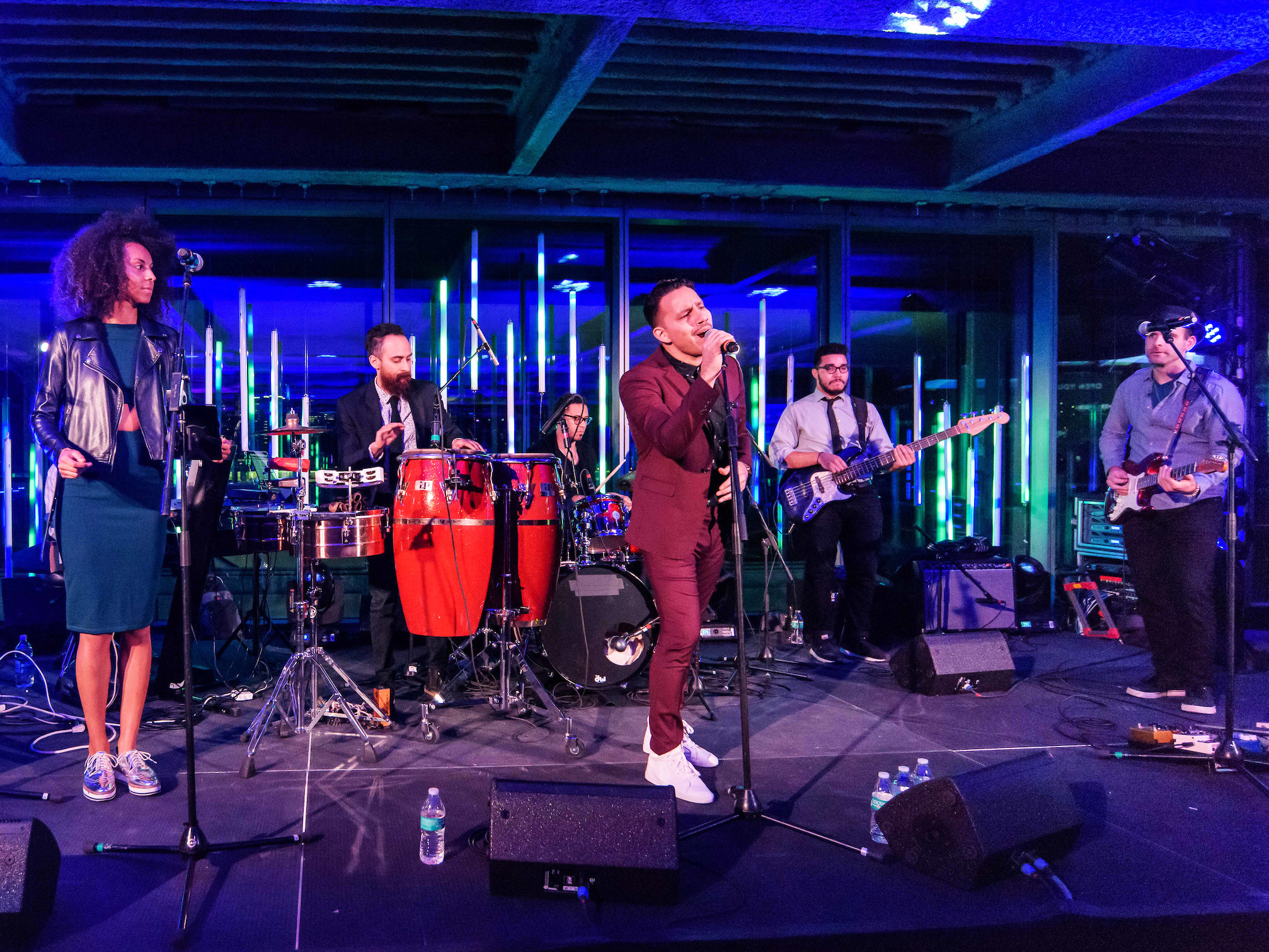 Guests arriving at the pier were greeted by a candlelit walkway leading them up to check-in. Upon disembarking on the rooftop, guests stepped into an elegant, all-black main space glowing with blue Astera light tubes designed to maximize the views of the skyline. Onstage, Vargas Productions and the BSKI Band kept the energy high with alternating sets of DJ-spun tunes and popular dance hits.