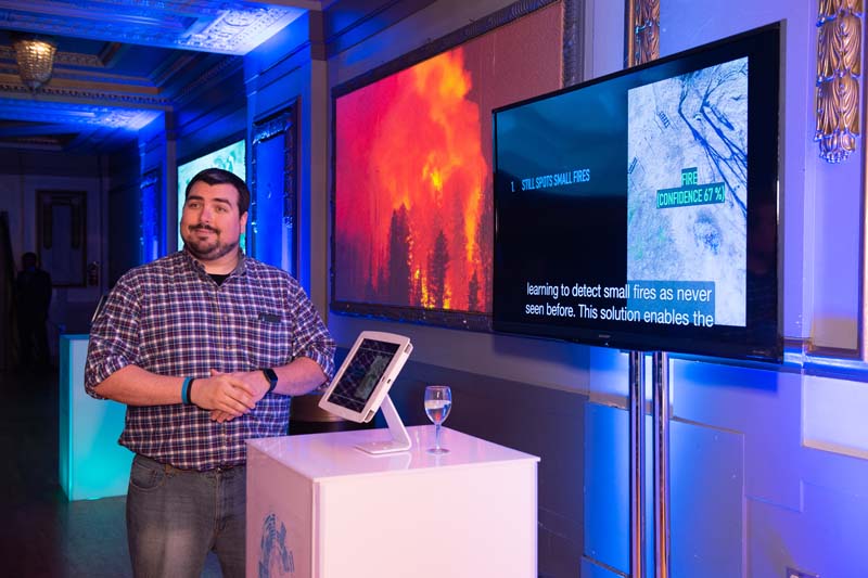 On arrival guests were met at the entrance by a mounted team of San Francisco first responders. The Awards event kicked off with a cocktail hour which included activations focused on hurricanes, wildfires, and earthquakes. Each activation had three elements–projected video footage of natural disasters, screen content to display developer solutions, and tablet computers with corresponding data. Guests were invited to interact with these activations and discover the impact natural disasters have once they hit.
