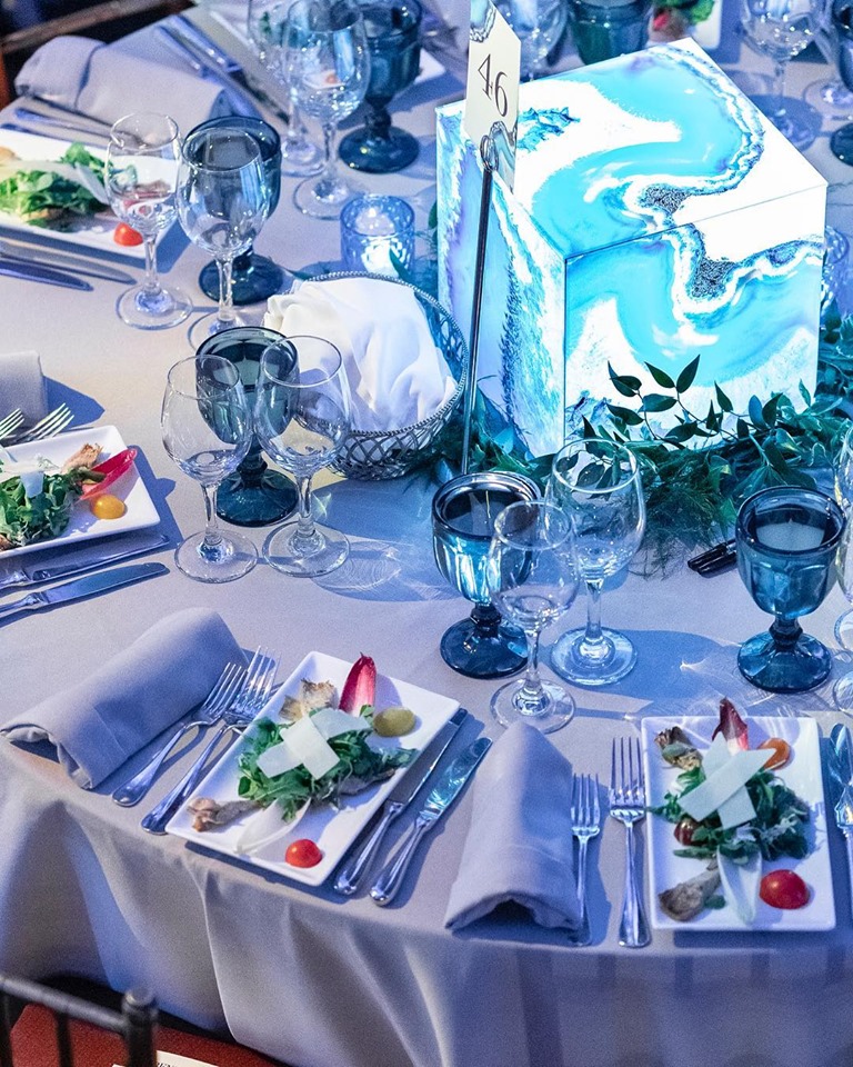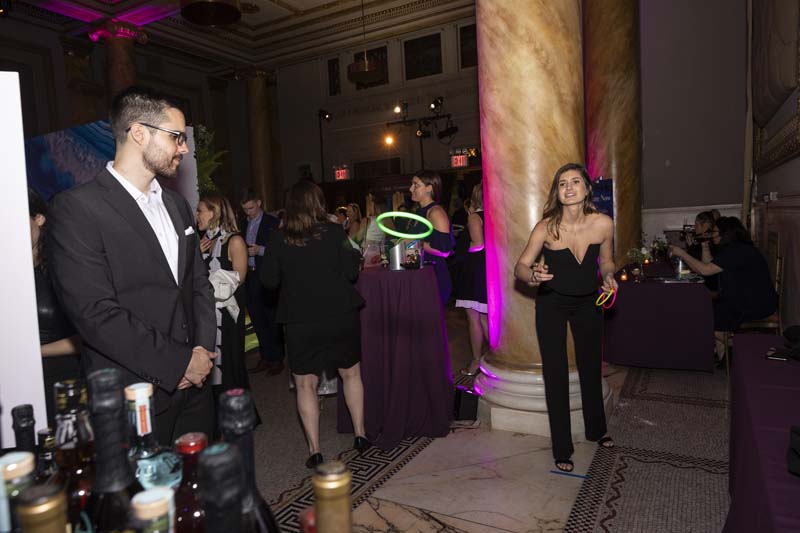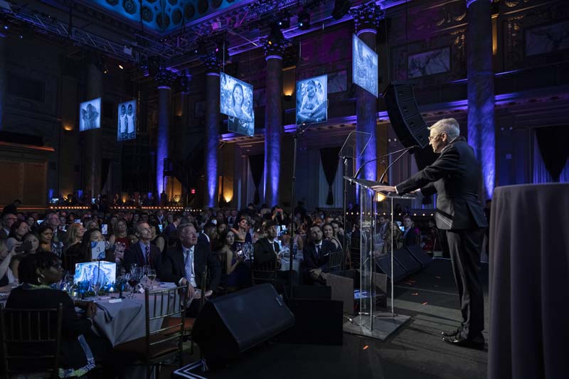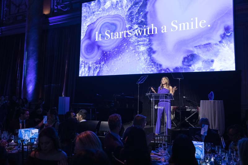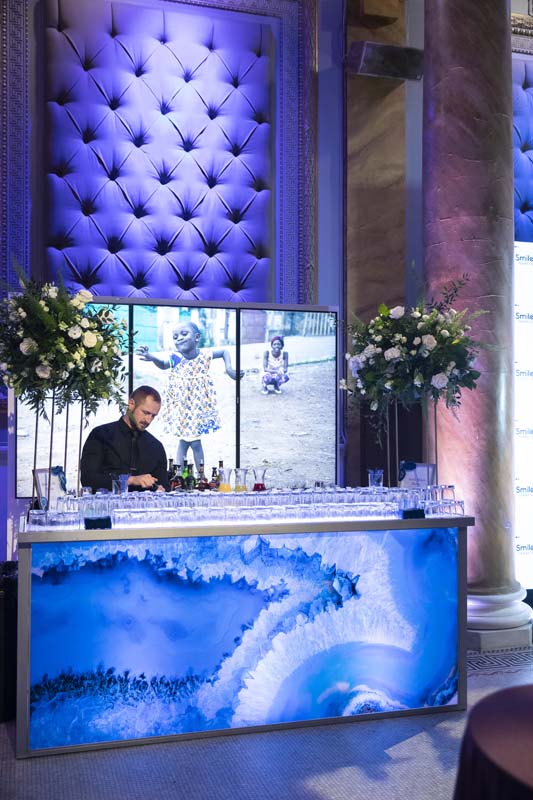 Inside the grand ballroom, large, heart-warming photos of Smile Train beneficiaries from around the world flew from the soaring skylight roof. Stunning decor included luminescent centerpieces with gorgeous geode designs and bars covered in matching images. Ambient screens with moving visuals were set up as backdrops behind each bar to ensure the room was glowing throughout.