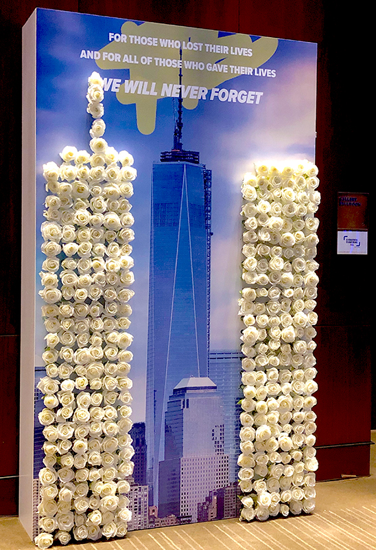 The final day of the conference took place on 9/11, 18 years after the devastating tragedy. A beautiful floral installation honored those affected by the events on 9/11 with a graphic wall featuring silhouettes of the twin towers built out using white roses.