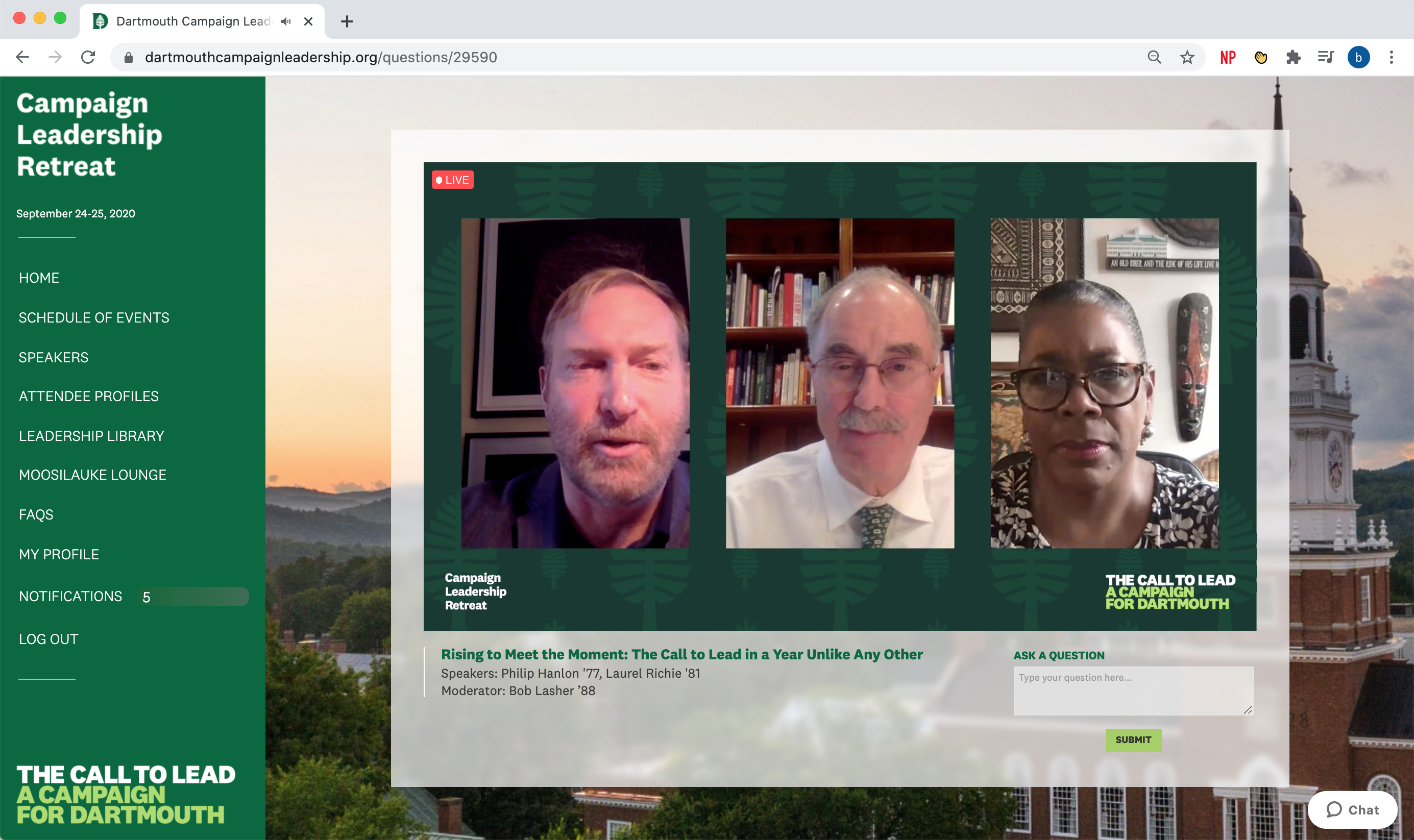 The Leadership Retreat began with a plenary discussion of what is at stake for higher education in these unprecedented times. Dartmouth College President Phillip J. Hanlon and Laurel Richie, Chair of Dartmouth’s Board of Trustees, outlined Dartmouth's plans to proceed with purpose, empathy, and a heightened sense of possibility. Key members of the College’s leadership, board of trustees, and volunteers were then invited to actively participate in smaller, more intimate customized workshop sessions across areas of the virtual event platform.