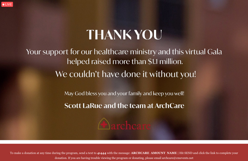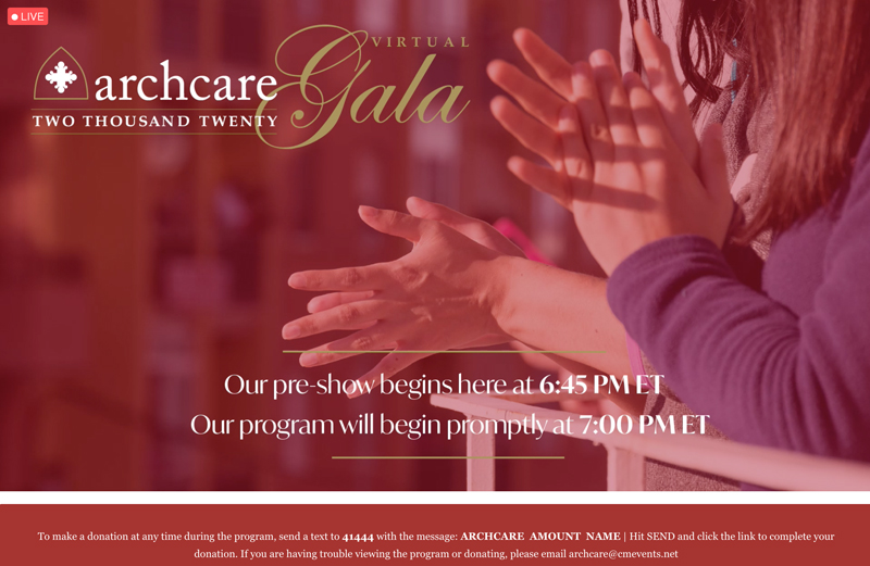 Before the program began, guests joined the microsite to preview the evening’s agenda below the video player window and view the donor scroll. The evening opened with a welcome video and invocation by Monsignor Joseph P. LaMorte followed by the ArchCare Gala’s traditional performance of “God Bless America”—sung by the New York Tenors.