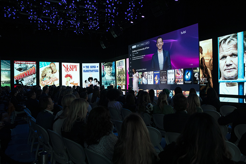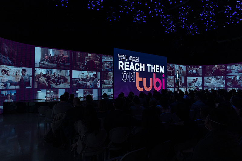 Guests were then welcomed into a specially created immersive theater to view the stage program which featured both in-person and pre-recorded presenters. Screens surrounded the entire audience, immersing them in the Tubi interface and mimicking the look and functionality of the dynamic platform. As host Vivica A. Fox and a series of Tubi executive speakers appeared, guests were transported into environments representing the breadth and depth of Tubi’s content catalog of over 40,000 films and television series. These environments included riding horses in the wild west with Brad Pitt, romantic walks in Paris, and even a world stage soccer game experience with Réal Madrid. The concise 45-minute program with sizzle videos, surround-motion graphics, live moments, and surprises conveyed to the audience the reason why Tubi is experiencing explosive growth and is positioned for much, much more.