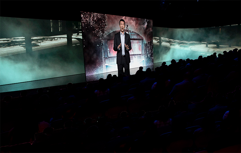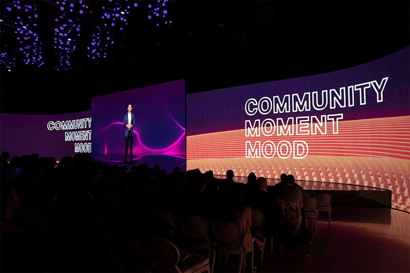 Guests received their first taste of technological innovation at registration, where they were welcomed by name on a reactive LED screen installation covering the full width of the entry wall. A large lunch café was created with a décor scheme that incorporated custom-built, ceiling-high steel LED frames draped with foliage to create smaller, intimate restaurant-style spaces that displayed both technology and nature.
