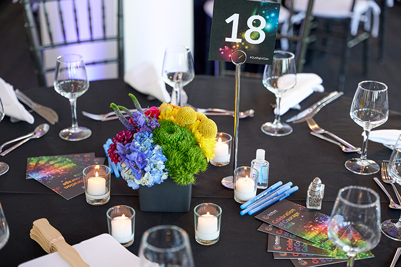 Guests were then seated in the 12th-floor dining space, decorated in an elegant rainbow color palette. During dinner, the stage program recognized three distinguished honorees: Feminist Lesbian & Academic Activist, Gloria Careaga; Proctor & Gambles’s Senior Director of Global LGBTQ + Equality, Brent Miller; and Artist & Activist and Co-Founder of Pussy Riot, Nadya Tolokonnikova (who received her award remotely). Outright board members also participated in the stage program.