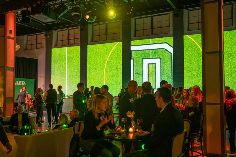 Excited guests wearing bracelets lit in green exited the theater program to attend the afterparty. Guests mixed, mingled, and networked while enjoying a curated menu of food and drinks; a live jazz band; and multiple activities including ping-pong on green and white tables, a photo booth, an interactive social media wall, and a variety of Instagram-worthy backdrops including a sculptural installation of large-scale letters spelling out “Dartmouth.”