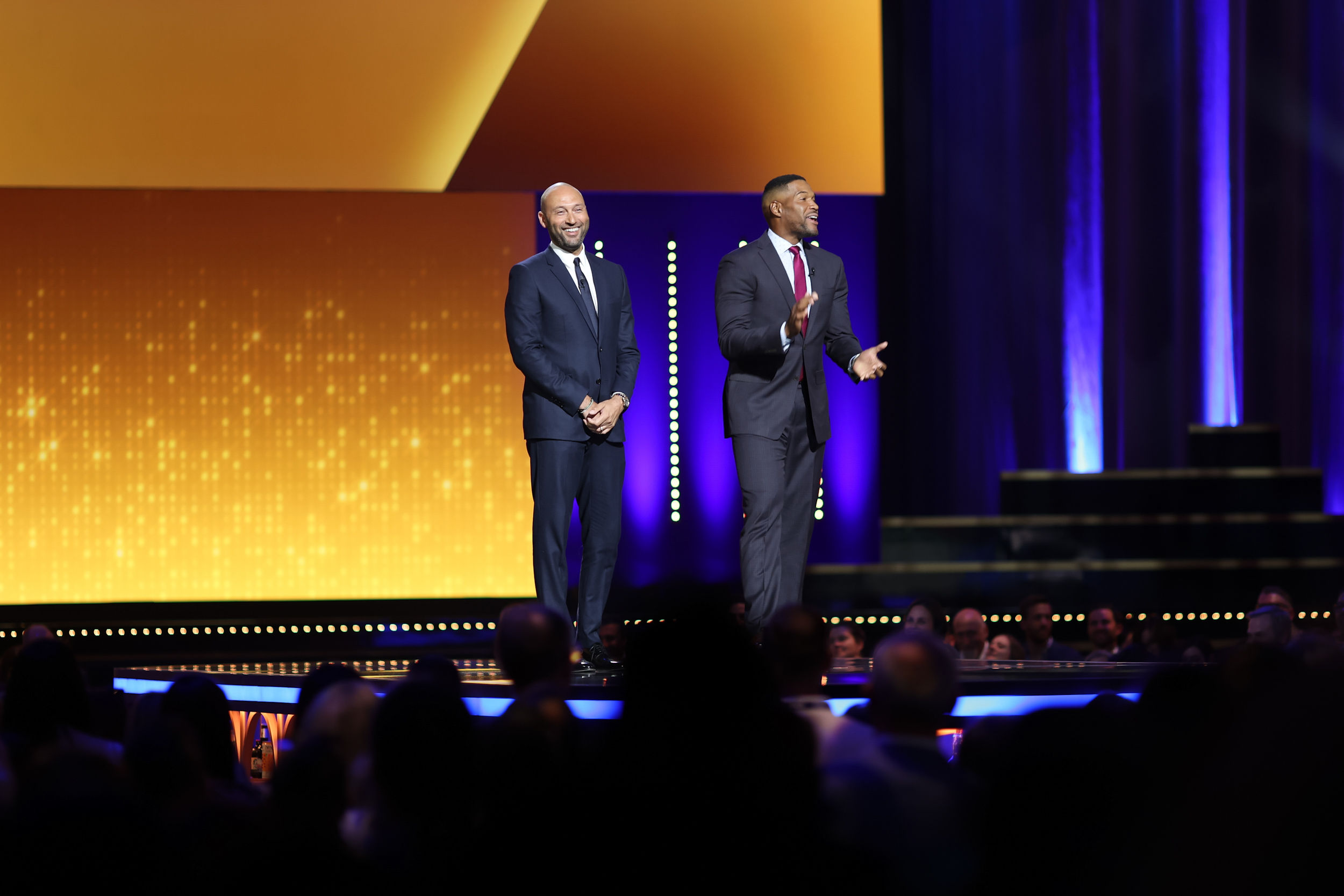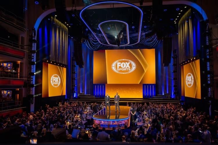 The program boasted an impressive roster of talent, including Gordon Ramsay, Alex Rodriguez, Derek Jeter, Michael Strahan, Erin Andrews, Carli Lloyd, Rob Gronkowski, and DJ Natasha Diggs. Cabaret-style seating spread across three levels encouraged conversation and connection. FOX’s signature branding was woven throughout the space, with rich blue as the hero color accented by burgundy, gold, magenta, and amber to represent the network’s subdivisions.