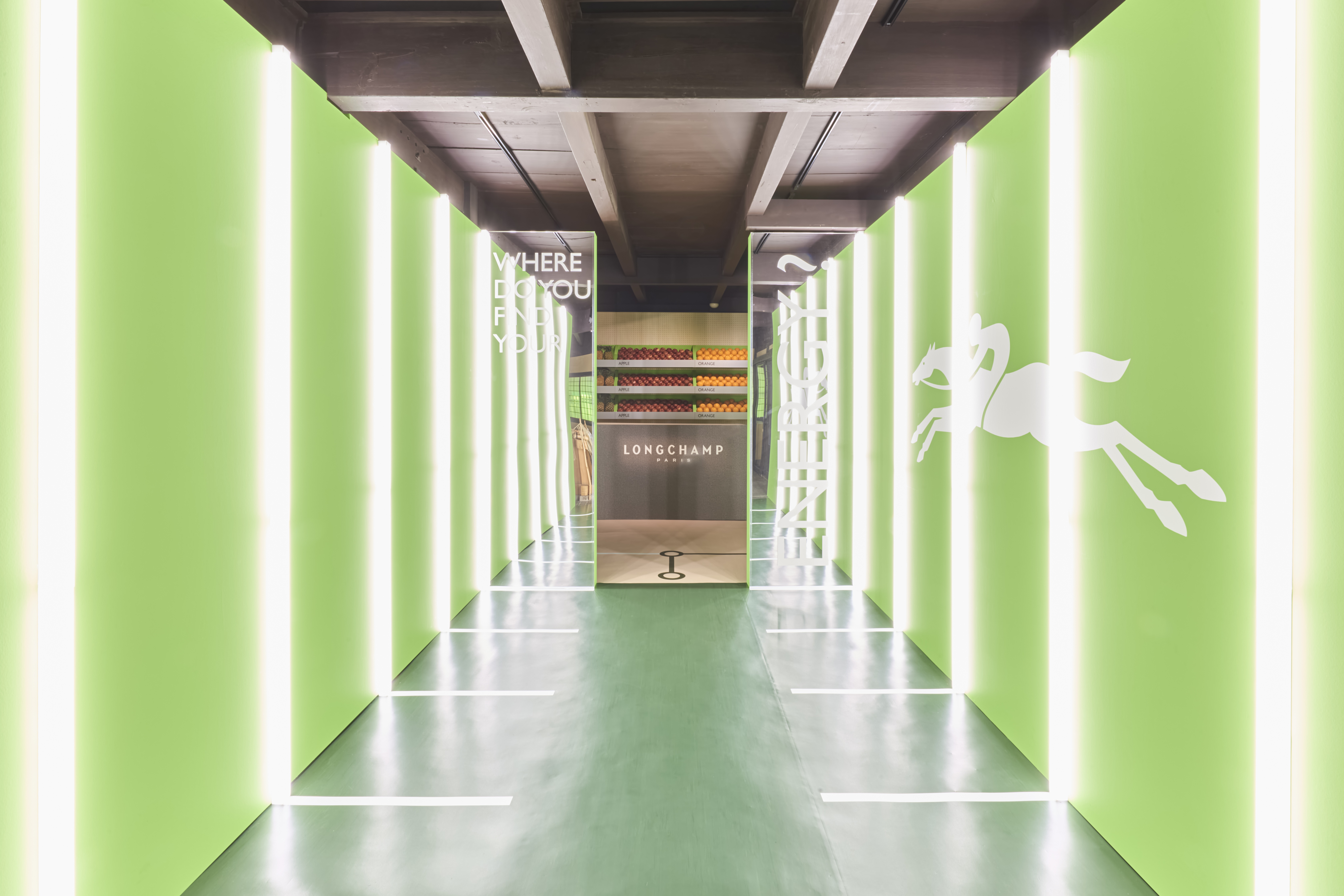 Longchamp brought its ENERGY BY LONGCHAMP global pop-up series to Kyoto in September 2024, turning the Shimadai Gallery into a dynamic playground of brand energy. Welcomed by lanterns bearing the Longchamp emblem and bamboo benches inspired by the brand’s bag toggles, guests stepped through a noren curtain into an immersive corridor of radiant brand colors.
