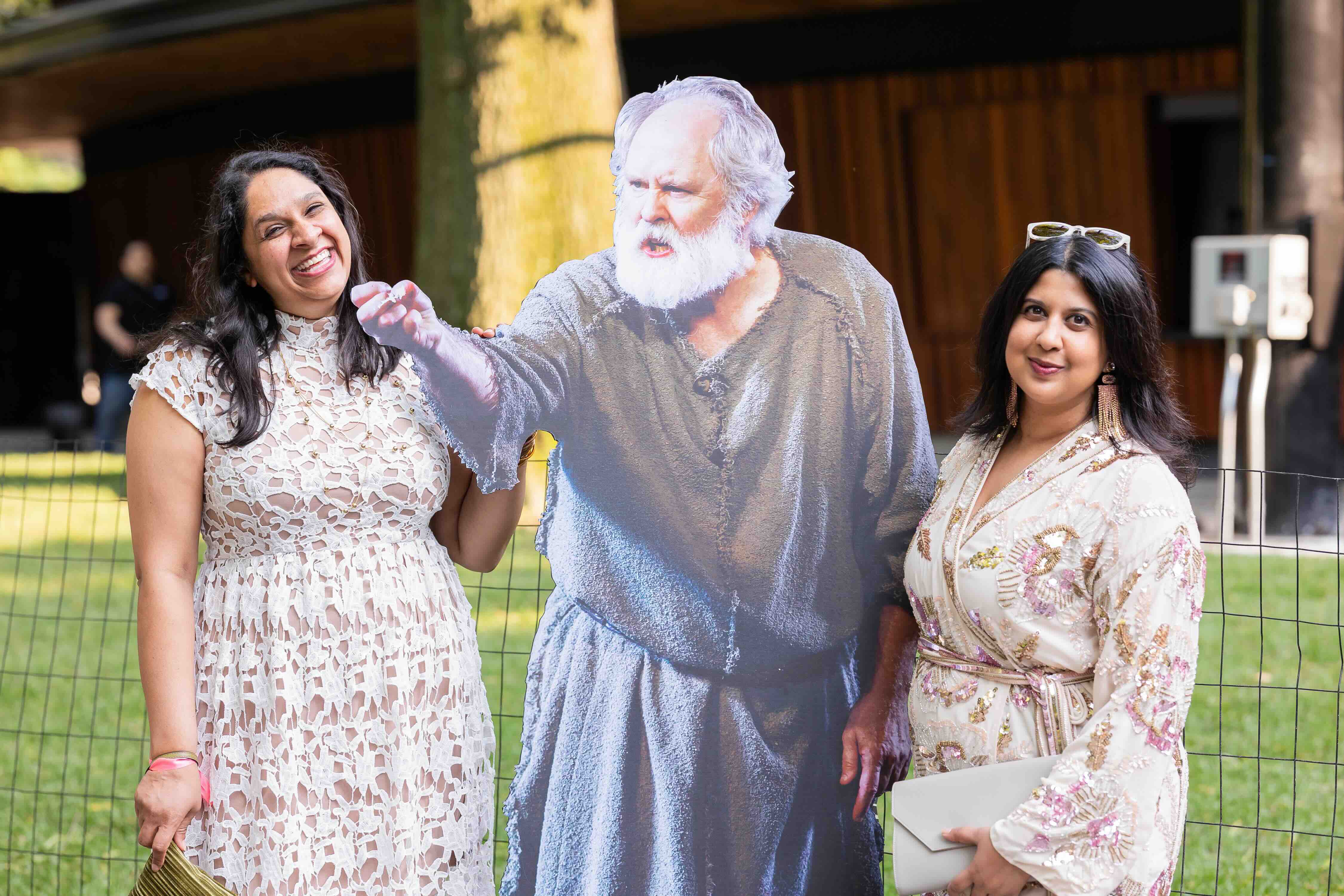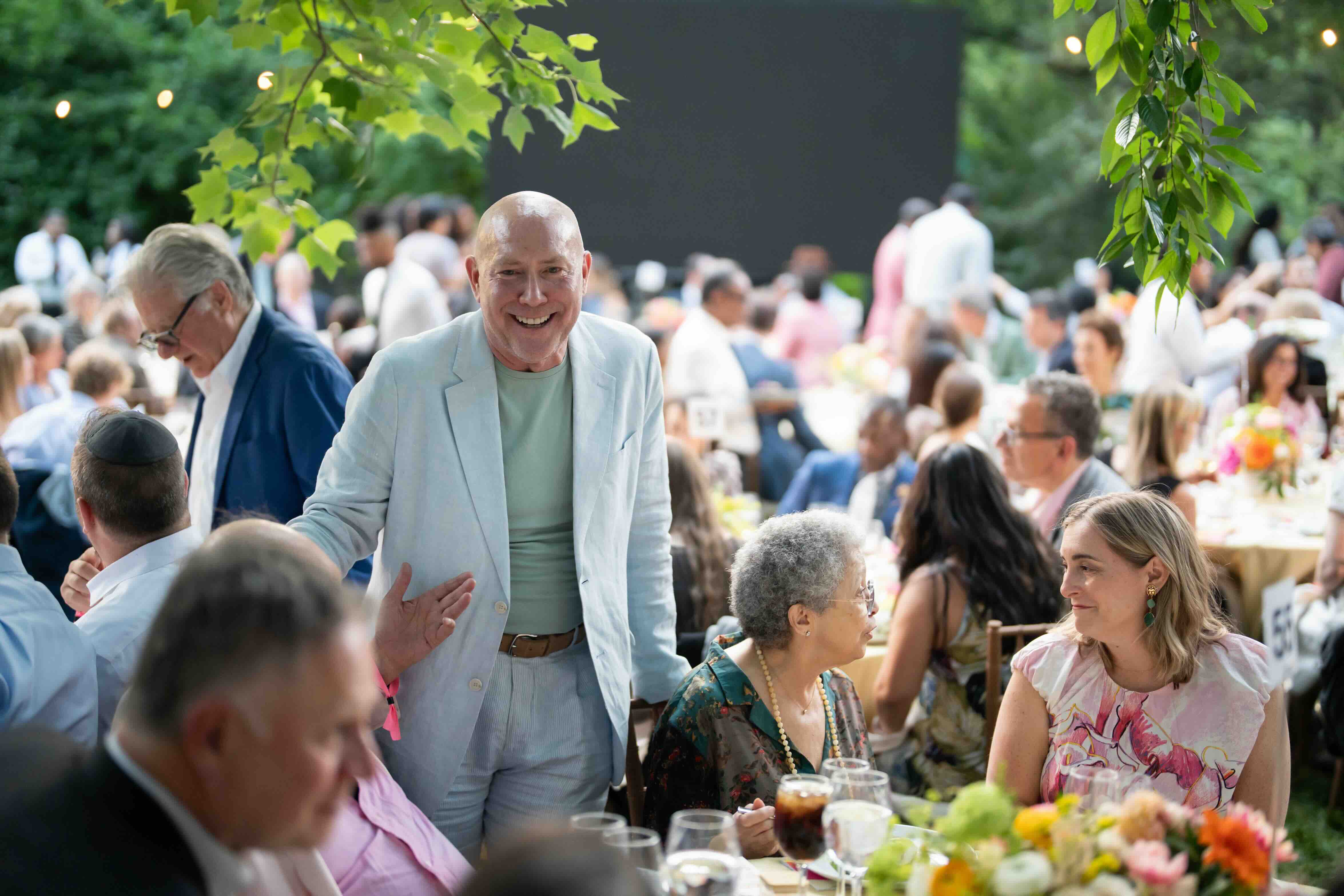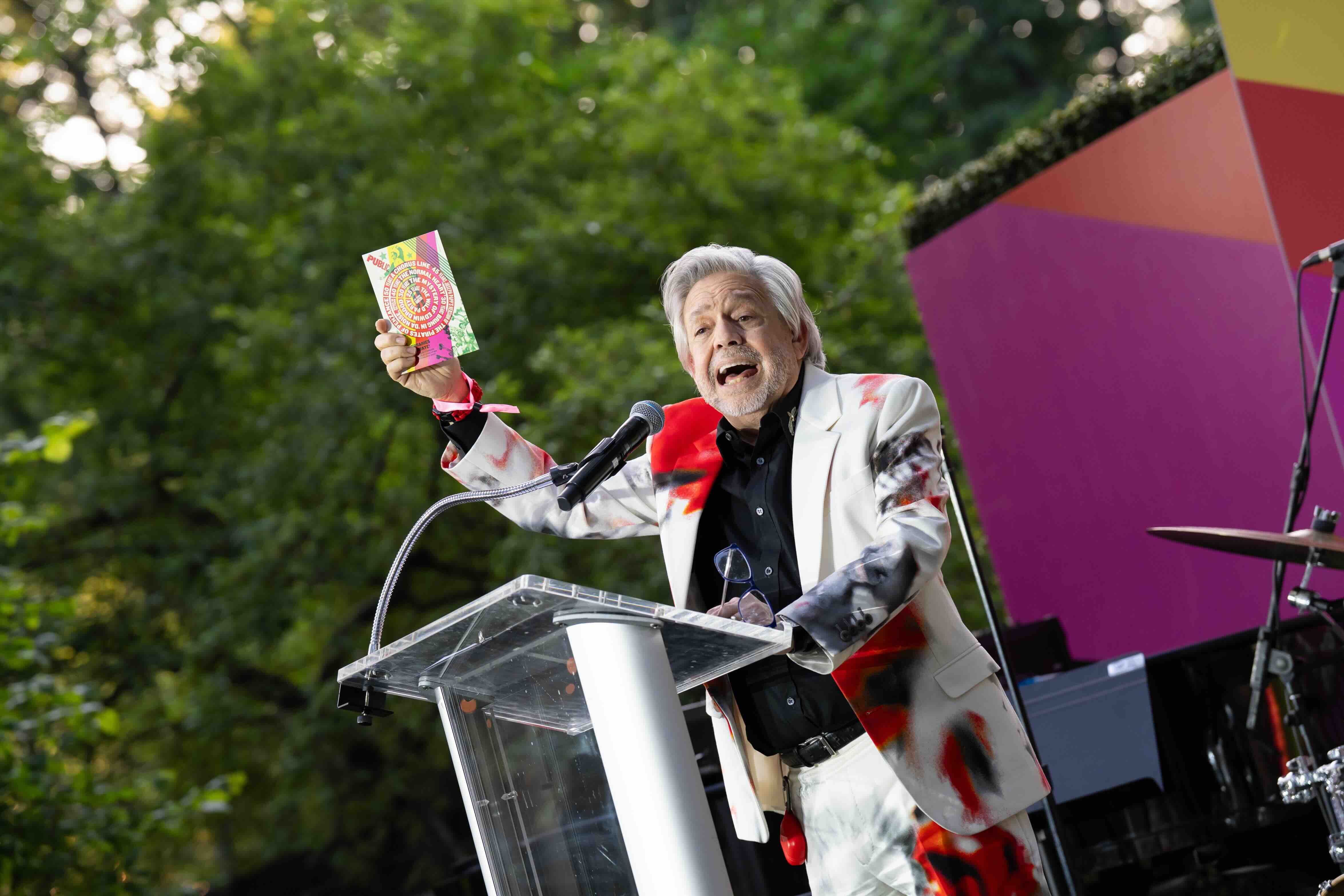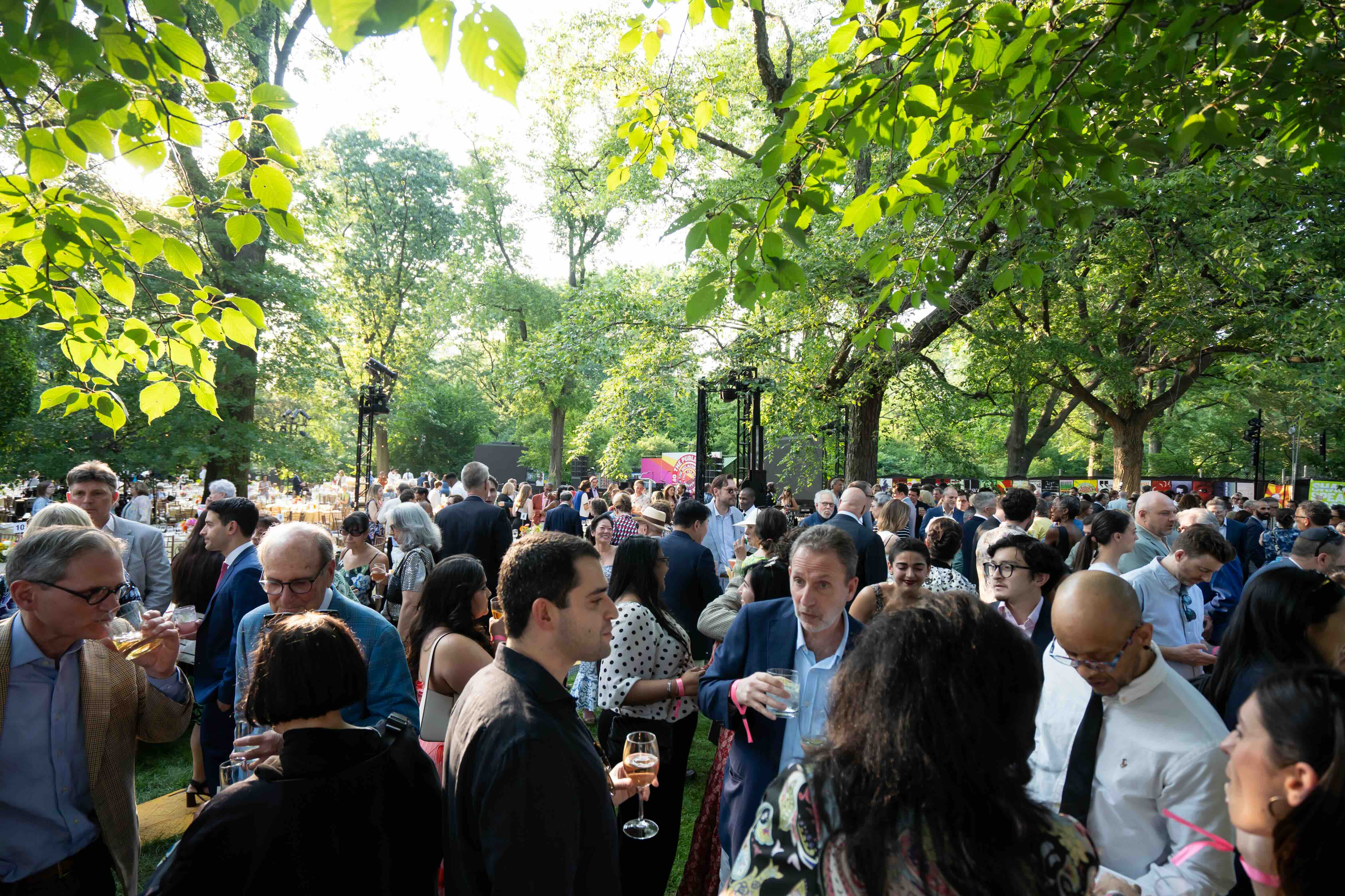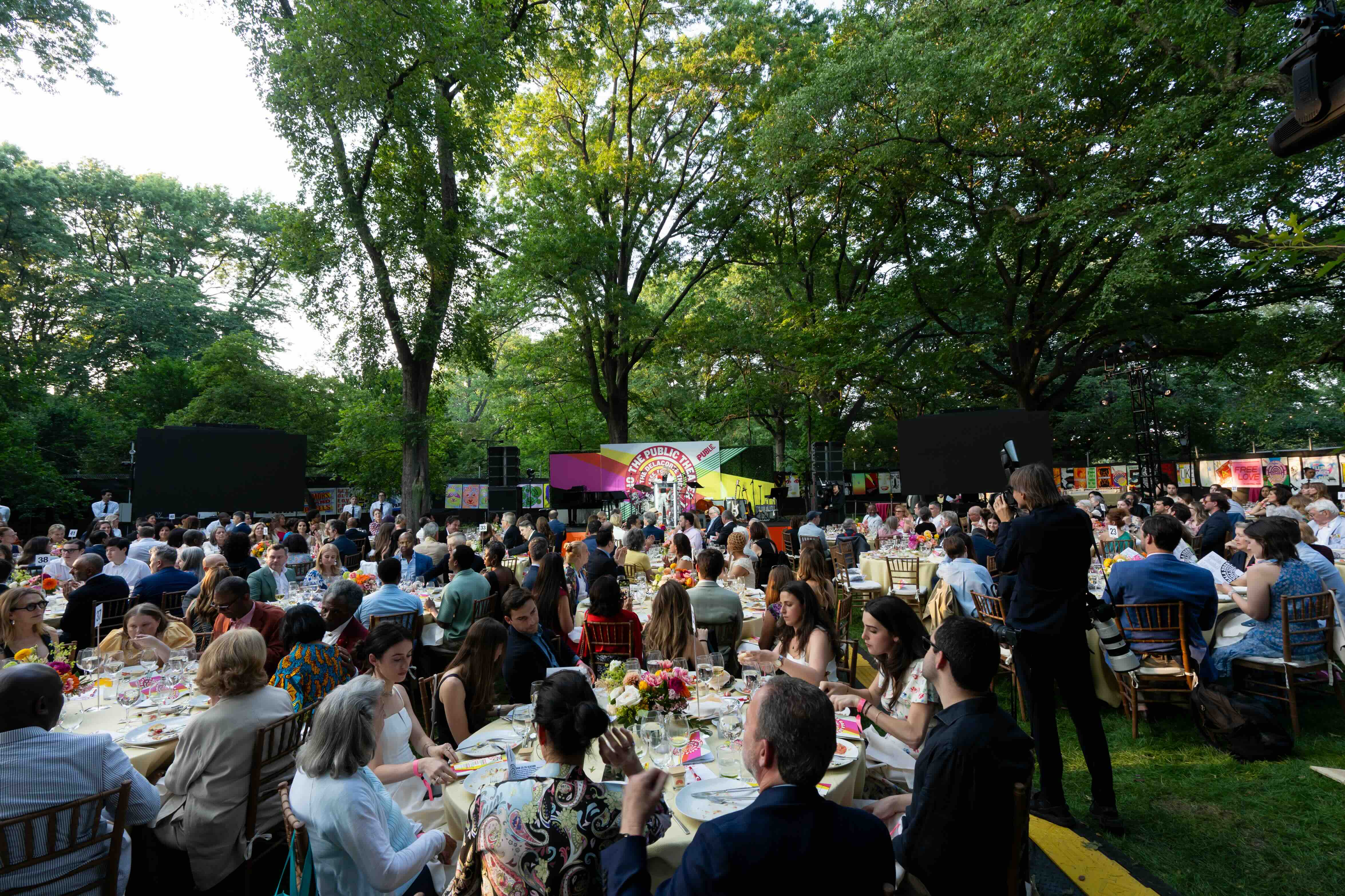 The Rahul Shah Trio set the atmosphere for the cocktail hour where guests were delighted by instant portrait photography to commemorate the occasion. In celebration of Hamilton’s 10th anniversary, Leslie Odom Jr.’s jubilant performance filled the air with energy, while Renée Elise Goldsberry’s graceful, effortless vocals lifted the night to new heights, culminating in a thrilling countdown to illuminate the Delacorte. Passionate remarks by Executive Director Patrick Willingham, Artistic Director Oskar Eustis, and Board Chair Luis A. Miranda Jr. honored the enduring support of the Jerome L. Greene Foundation and designer Paula Scher, whose bold artwork framed the lawn’s perimeter.