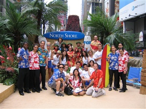 Added to this were teams of performers, all cast, contracted, costumed, trained and supervised by Empire. This cast included male and female surf instructors, a team of catering servers who passed out original Hawaiian punch concoctions in branded FOX cups, a street team of 8 surfer dudes & girls in branded beach attire who worked the busy sidewalks of Broadway giving out premium items and building traffic on the island, and a running crew, all attired in Hawaiian shirts. On stage, an awesome Hawaiian music & dance ensemble, The Tiny Bubble Band, consisting of guitar, ukulele, congas and bass performed while a cast of 4 hula dancers in grass skirts performed traditional dances of Hawaii. In front of the stage, actress Brooke Burns and other stars of the show appeared live on FOX's Good Day Live and gave interviews for Access Hollywood, Extra, WNYW and other media. Brooke also posed for photos with fans, gave autographs and even participated in some of the surf lessons and hula activities.