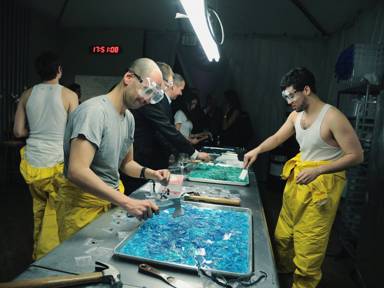 The final stop through the AMC network brought guests in to a “functioning” meth lab, where workers in yellow Tyvek suits prepared the drugs on an industrial scale and then smashed up and bagged blue “meth” rock candy for guests to take home with them. In between each space, guests were served cocktails and hors d’eouvres, and had the opportunity to enter the main, central party space to mix and mingle. Here, the message was simple: AMC, Something More. Tufted black leather couches with gold detailing, black carpet, and 100’ high ceilings with dramatic uplight set the tone of the affair. An abundance of food stations from steak carving to dim sum offered guests a multitude of delicious culinary options. In this main space, AMC President and General Manager, Charlie Collier led a brief presentation stating: “We just have two goals in mind—celebrate (our) brand and thanking you with a real AMC experience.” Following the presentation, the stars of each show descended upon the crowd to converse with guests and partake in numerous photo ops.
