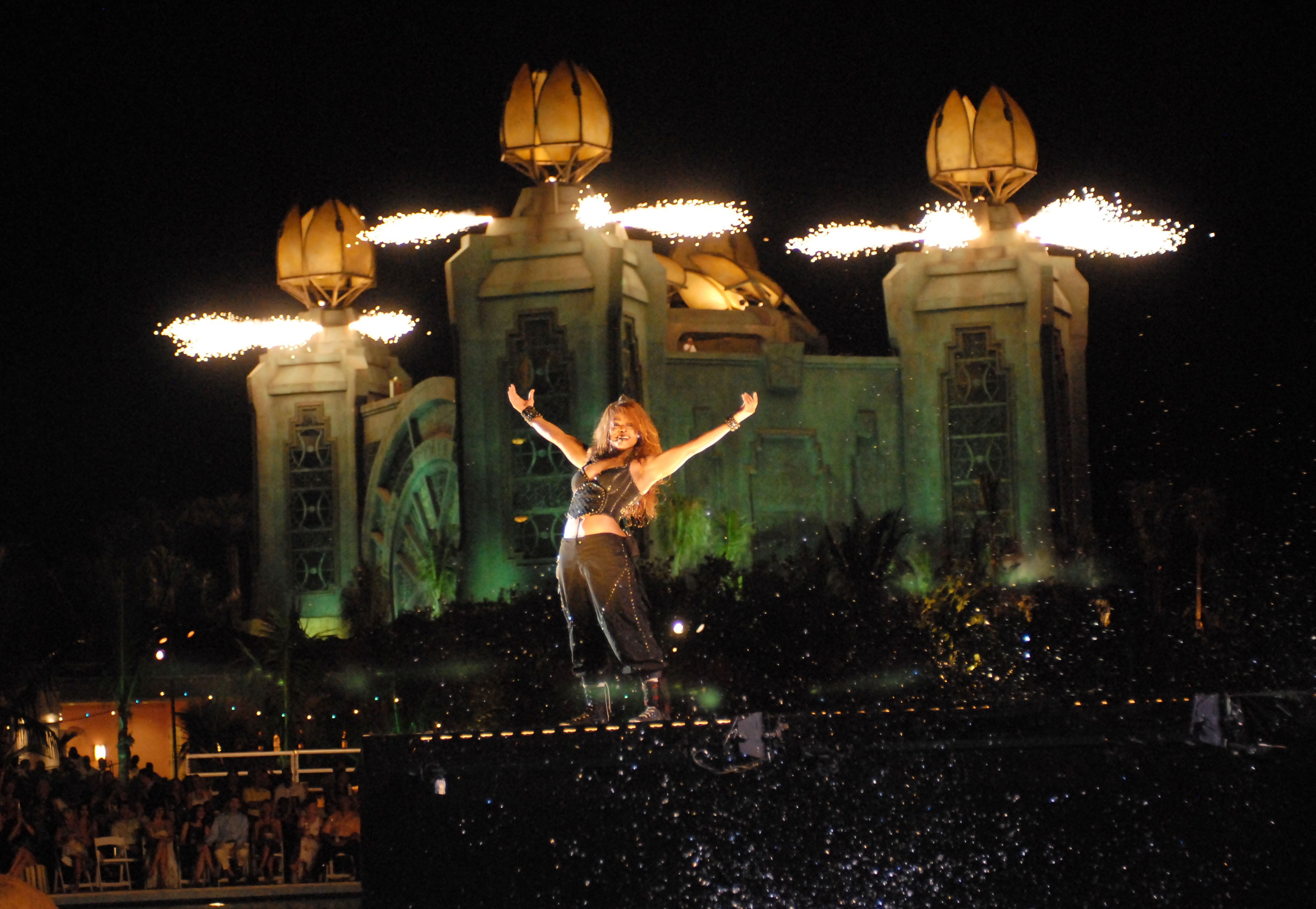 The Friday night party event was set around the new Aquaventure poolside at the foot of the Cove. Guests were greeted with Tequila shots being poured by The Screaming Queens from inside tables where they were costumed as lavish nautical creatures. Members of Body Cast posed as additional aquatic themed, body painted eye candy, as guests listened to the musical stylings of the very glamorous DJ, Donna D'Cruz. The event built up to when a fireworks cue drew everyone's attention to the enormous main stage set in the pool and the surprise reveal of Janet Jackson who came out and delivered an amazing 25 minute concert of her greatest hits. On cue, at the completion of her set, an impressive fireworks display by Grucci began and wowed everyone on Paradise Island!