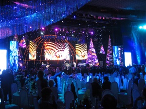 That evening, guests arrived dressed in ‘Geek Chic' attire for the recognition dinner. Following a cocktail hour, guests entered a ballroom that Empire had transformed into a space-aged fantasy. Square tables set with dark grey linens, silver chargers and square glass centerpieces sat arrayed in lines below a light ceiling in blue chase lights. Each centerpiece glowed with white pin-spotting. Looping footage of high resolution space animations ran on dual projection screens while beams of cobalt blue lighting slowly tracked the room. The evening featured a keynote address and Q&A by the company's chairman followed by a set of side-splitting humor by former Saturday Night Live player and Wayne's World star, Dana Carvey.