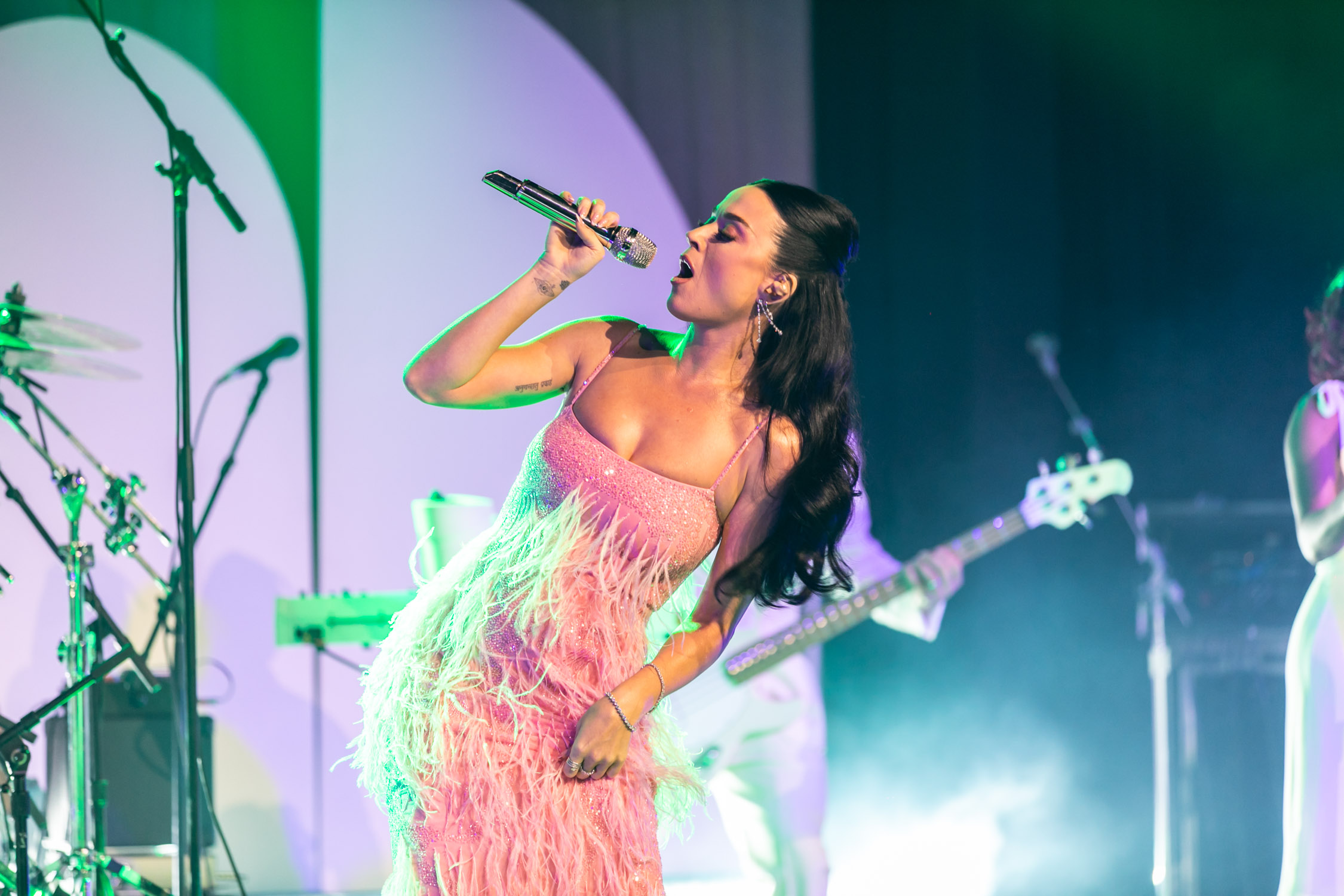 The Palladium was transformed into an homage to Vanderpump Rules, with sleek white, purple, and burgundy lounge furniture; lush, leafy tropical foliage; and an abundance of fresh flora in pink and purple, all aglow with pink and purple LED lighting.
